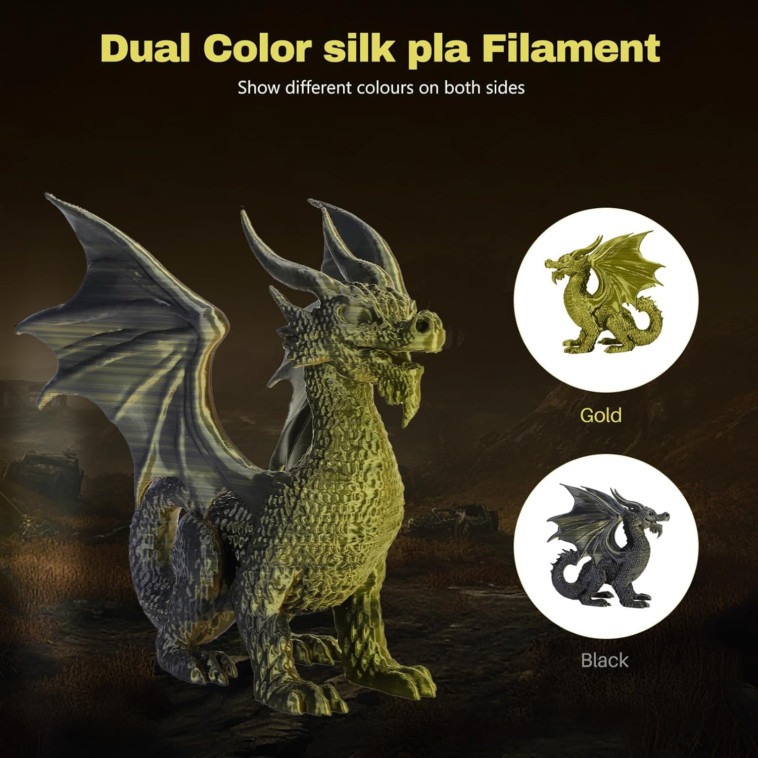 - 【Silk Dual Color PLA】You can get a gorgeous 3D printing surface. Shiny Silk Black Gold combination of magic 1.75mm PLA filament, make the two sides of your print appear in different colors. Every inch has has two colors. This gives your prints not only a smooth and shinny appearance, but also a unique color pattern and effect.