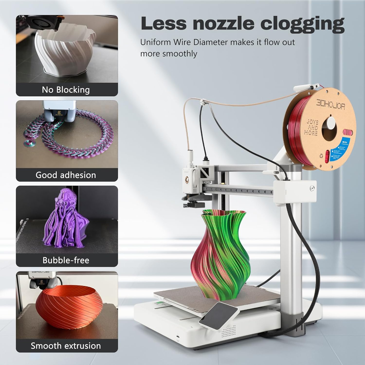 - 【Easy to print】The diameter of 3DHoJor silk filament is 1.75mm +/- 0.03mm. Precise wire diameter ensures continuous and stable feeding without clogging. It has perfect first layer adhesion to reduce warpage, shrinkage and print failure. Good shaping, no bubble, no warping, melt well, perfect for beginner or expert.