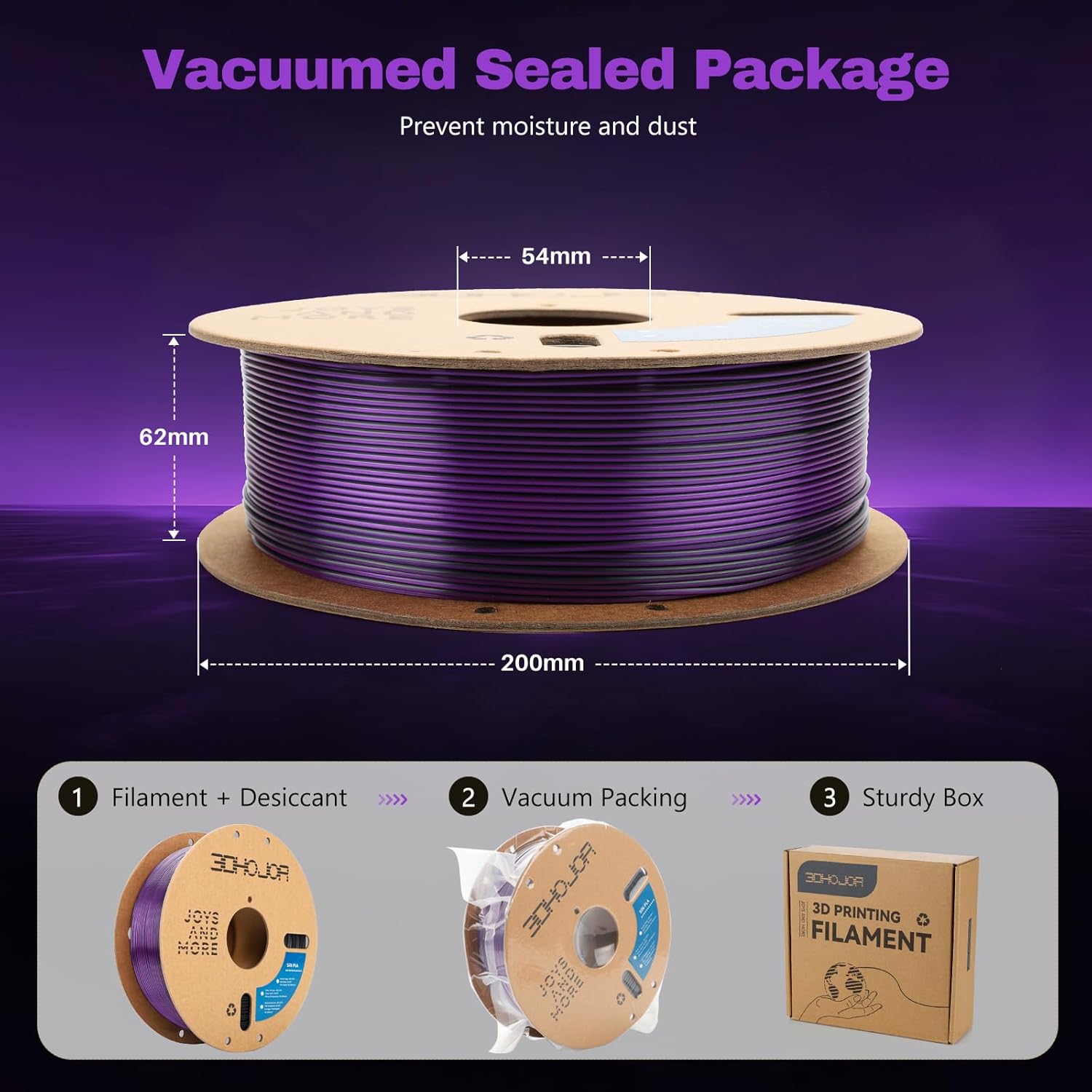 - 【Silk Dual Color PLA】You can get a gorgeous 3D printing surface. Shiny Silk Black Purple combination of magic 1.75mm PLA filament, make the two sides of your print appear in different colors. Every inch has has two colors. This gives your prints not only a smooth and shinny appearance, but also a unique color pattern and effect.