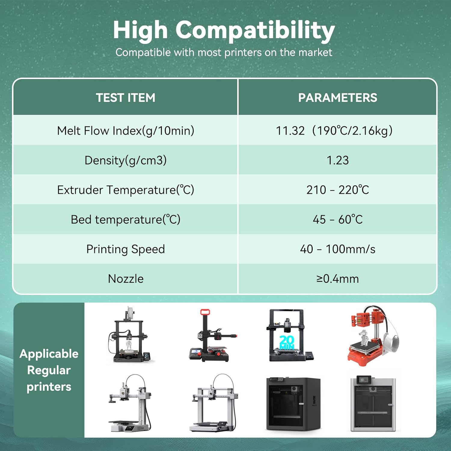 - 【Higher strength and better toughness】Compare with PLA, it has higher strength and better toughness.High Purity & High Precision. Low Shrinkage & Strong Layer Adhesion.