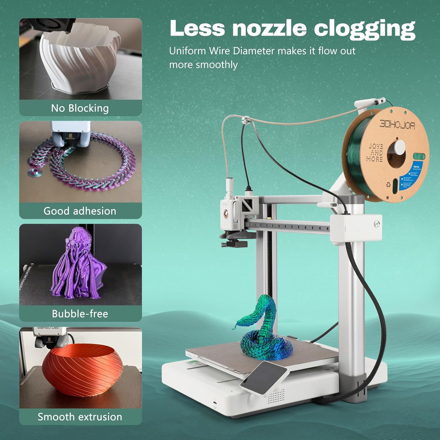 - 【Tangle-Free, Neatly Wound】: more resilient than traditional PLA, not easy to damage. Strict manual inspection ensures the neatness and easy feed of PLA filament winding. Vacuum-sealing guarantees moisture-free printing, eliminating clogs and bubbles, which increase your printing success rate.