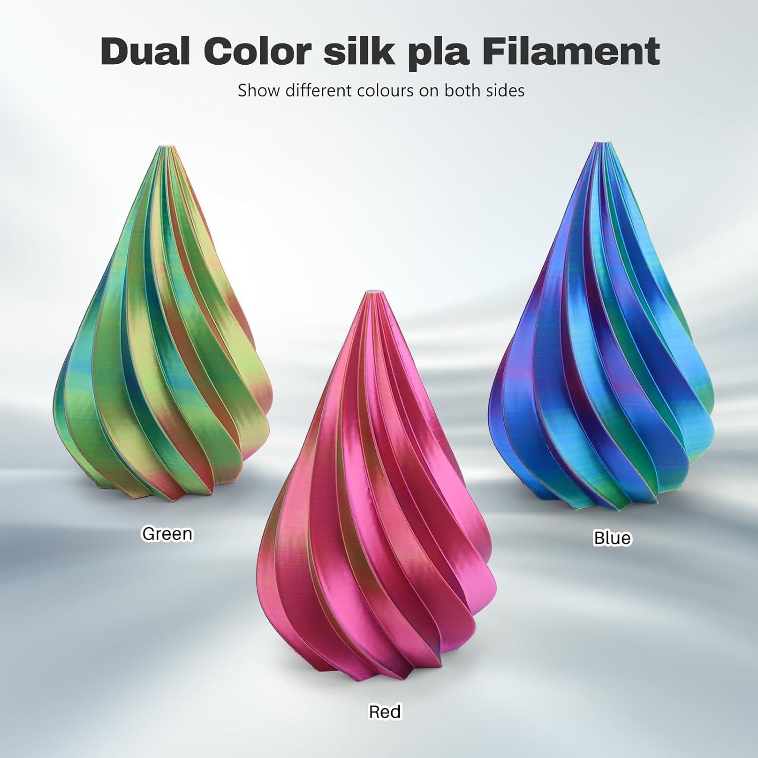 - 【Silk Triple Color PLA】You can get a gorgeous 3D printing surface. Shiny Red Green Blue combination of magic 1.75mm PLA filament, make different sides of your print appear in different colors. Every inch has has three colors. This gives your prints not only a smooth and shinny appearance, but also a unique color pattern and effect.