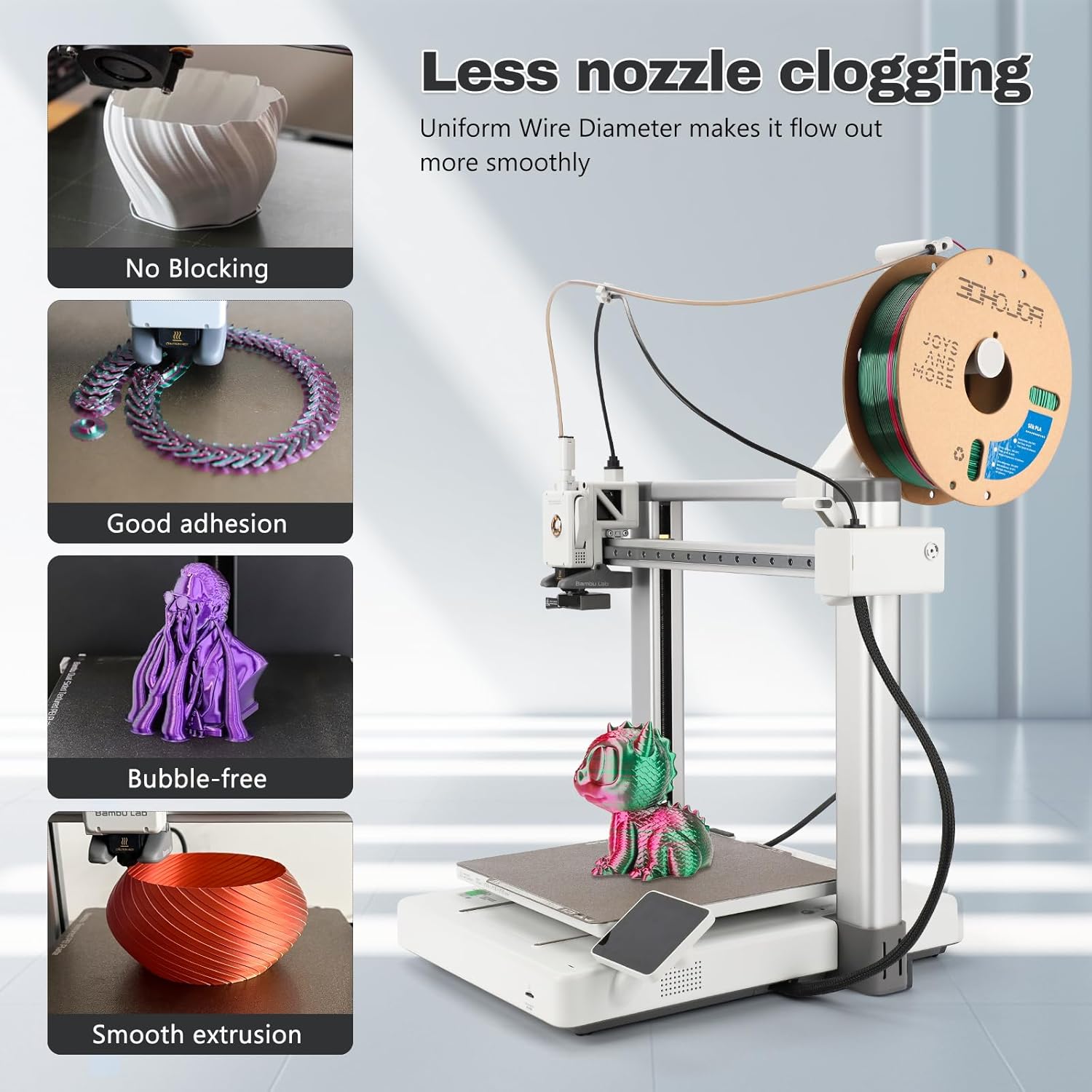 - 【Easy to print】The diameter of 3DHoJor silk filament is 1.75mm +/- 0.03mm. Precise wire diameter ensures continuous and stable feeding without clogging. It has perfect first layer adhesion to reduce warpage, shrinkage and print failure. Good shaping, no bubble, no warping, melt well, perfect for beginner or expert.