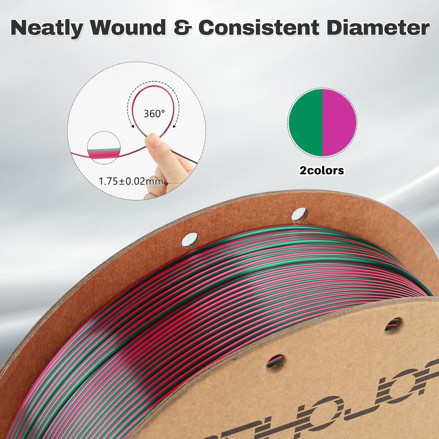 - 【Silk Dual Color PLA】You can get a gorgeous 3D printing surface. Shiny Silk Purple Green combination of magic 1.75mm PLA filament, make the two sides of your print appear in different colors. Every inch has has two colors. This gives your prints not only a smooth and shinny appearance, but also a unique color pattern and effect.