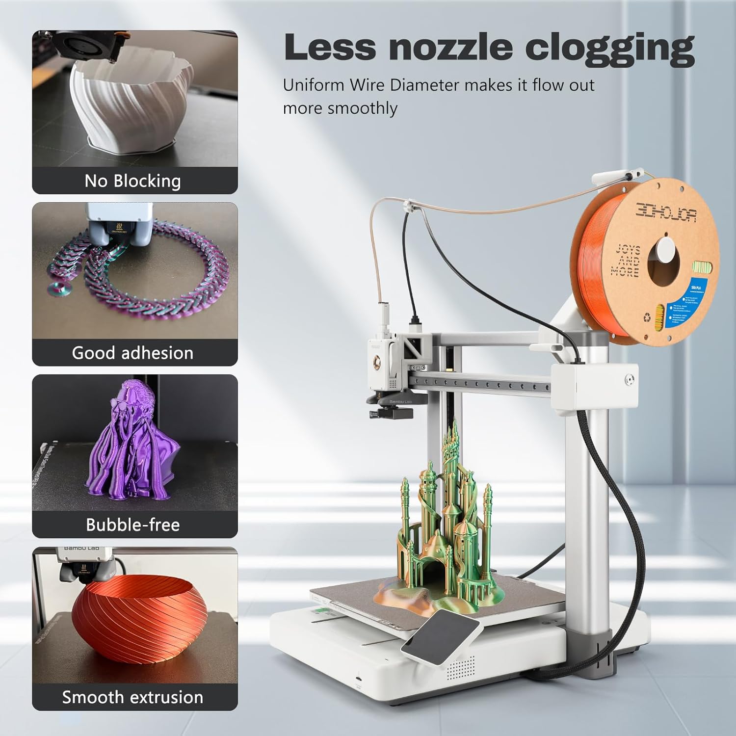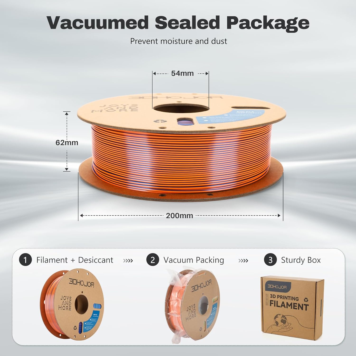 - 【Easy to print】The diameter of 3DHoJor silk filament is 1.75mm +/- 0.03mm. Precise wire diameter ensures continuous and stable feeding without clogging. It has perfect first layer adhesion to reduce warpage, shrinkage and print failure. Good shaping, no bubble, no warping, melt well, perfect for beginner or expert.
