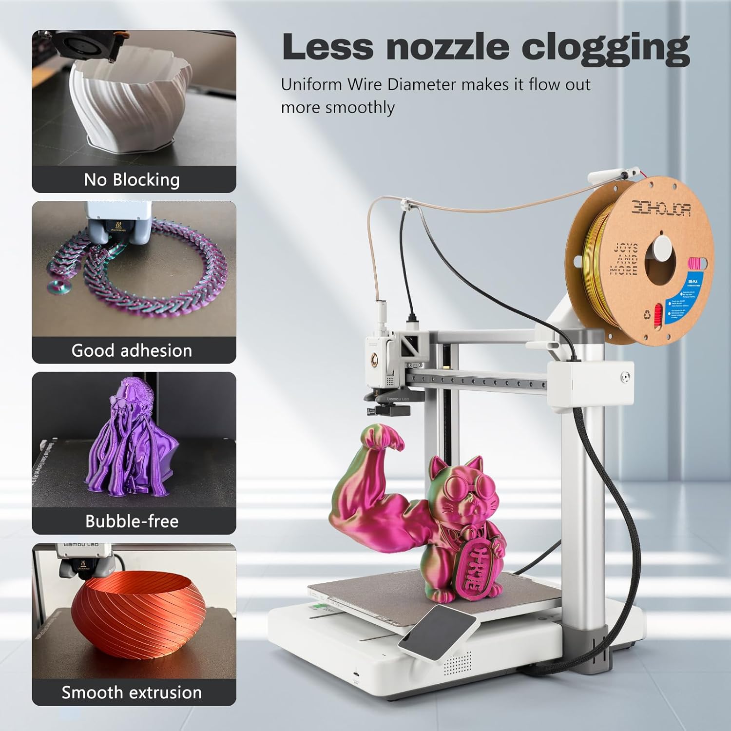 - 【Easy to print】The diameter of 3DHoJor silk filament is 1.75mm +/- 0.03mm. Precise wire diameter ensures continuous and stable feeding without clogging. It has perfect first layer adhesion to reduce warpage, shrinkage and print failure. Good shaping, no bubble, no warping, melt well, perfect for beginner or expert.