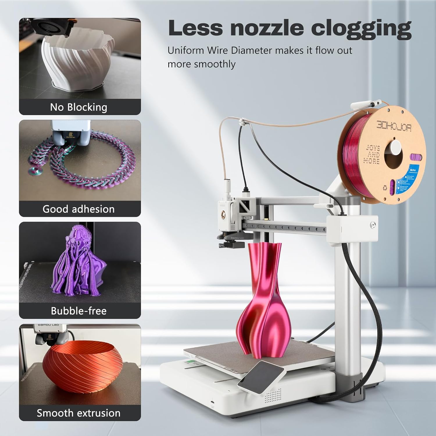 - 【Easy to print】The diameter of 3DHoJor silk filament is 1.75mm +/- 0.03mm. Precise wire diameter ensures continuous and stable feeding without clogging. It has perfect first layer adhesion to reduce warpage, shrinkage and print failure. Good shaping, no bubble, no warping, melt well, perfect for beginner or expert.