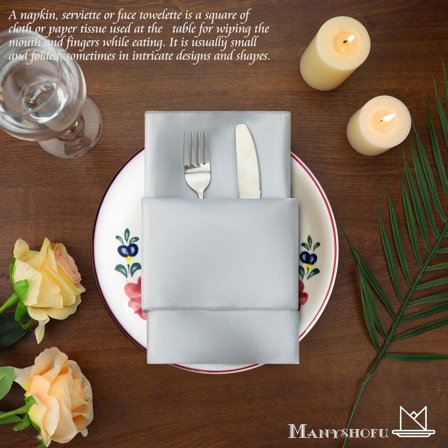 - πΊ[ Clever Design ]: The Manyshofu napkin not only has an elegant and simple surface, but also feels silky and textured. Not only that, the four sides are stitched neatly and tightly, making the surface smooth and delicate, avoiding the situation of line bifurcation. Satin napkins can be folded into various shapes to match different occasions. You can use your imagination, more decorative uses are waiting for you to discover.