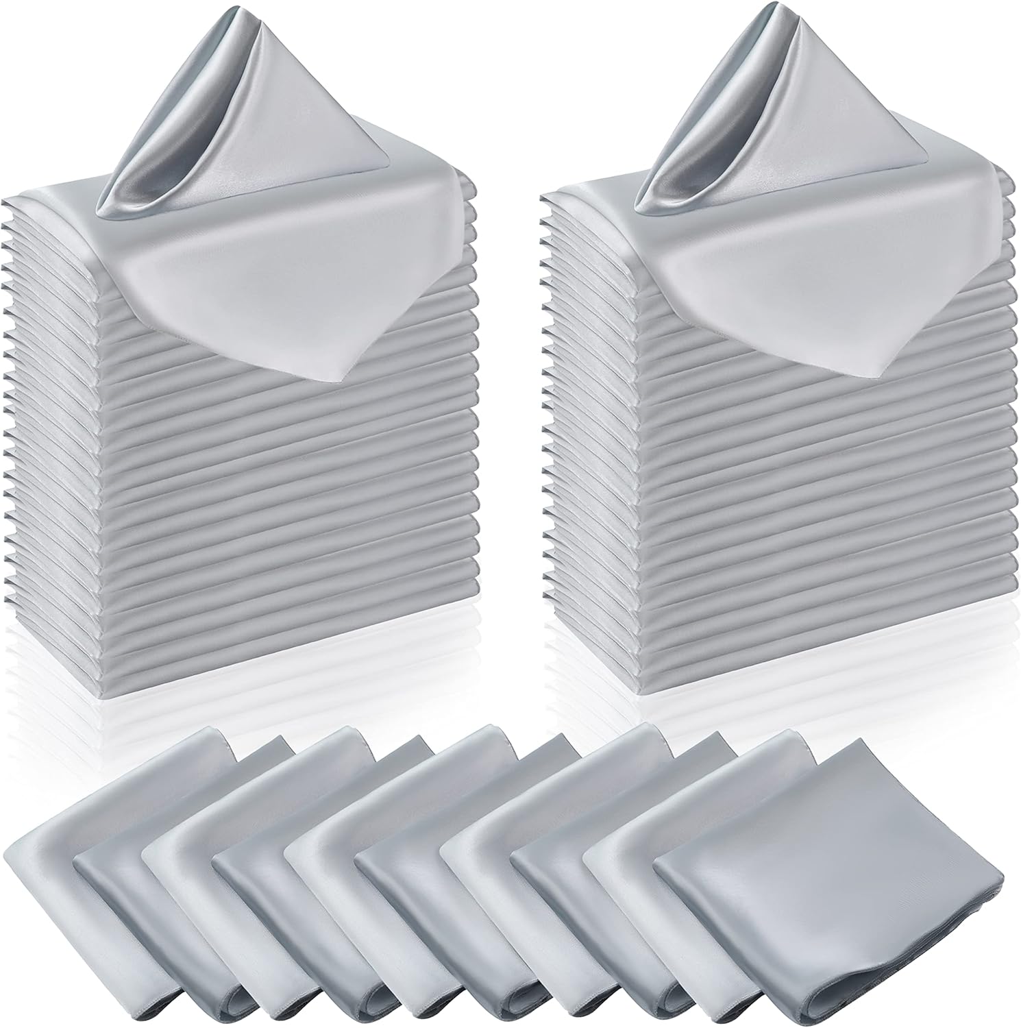 - πΊ[ Preferred Decorations ]: Package includes 50pcs x satin silver napkins (12" x 12"/30mm x 30mm). Numerous quantities will satisfy your napkin needs for every party. Satin table napkins are sized to decorate many occasions such as weddings, birthdays, banquets, buffets, dinner parties, parties, picnics, anniversaries, Christmas, Thanksgiving. It can also be used in kitchen, home decor, indoor or outdoor events. Definitely one of your daily must-have decorations.