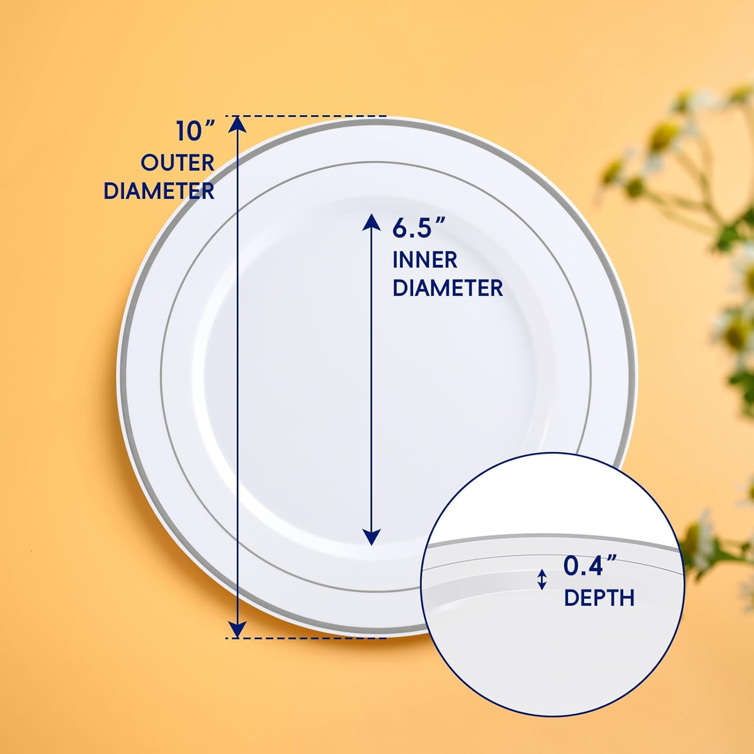 - Safety & Healthy: 100 pack disposable silver plates consist of white plastic plates with silver trim, made of food-grade materials, rigorously tested for safety . Give your family and friends peace of mind and satisfaction for a good time.
