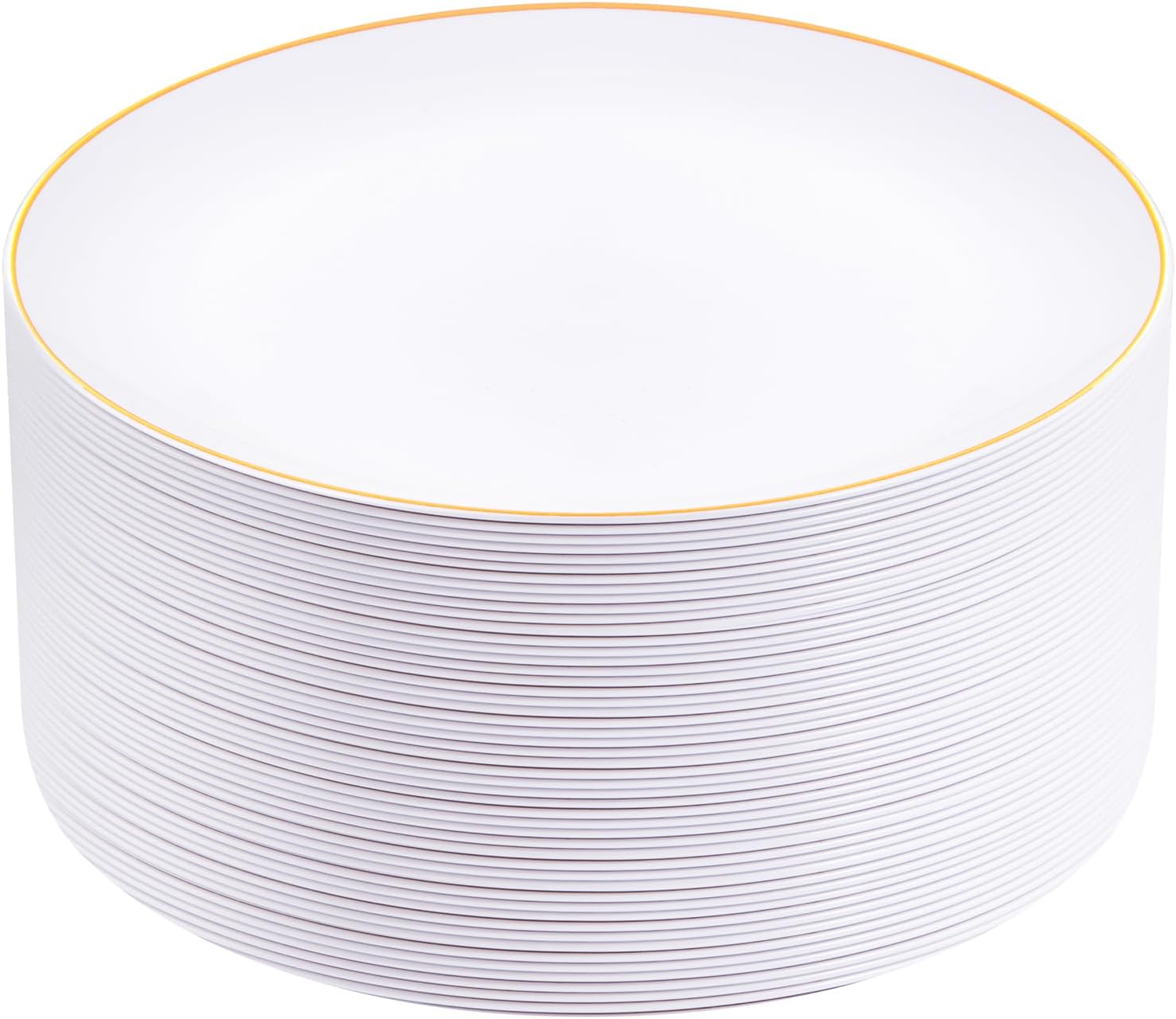 - MULTIPLE USES: The white plastic plates with gold rims are suitable for various occasions, such as banquets, Christmas or Thanksgiving parties, gatherings, weddings, etc., to meet the dining needs of large-scale events. Disposable plates are simple and modern design style, suitable for people of all ages.
