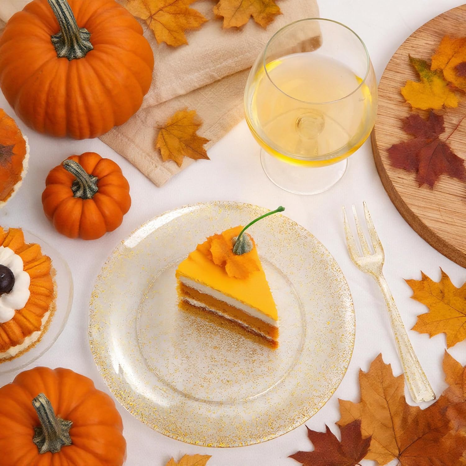 - BRILLIANT GOLD GLITTER: This 6.3" gold glitter plastic dessert plates and 5" plastic forks set with 100 pcs comes with a charming gold glitter effect, add a sparkling glamour to your appetizers, cakes, salads, cookies and desserts, these plastic dessert plates make the dining experience more wonderful.