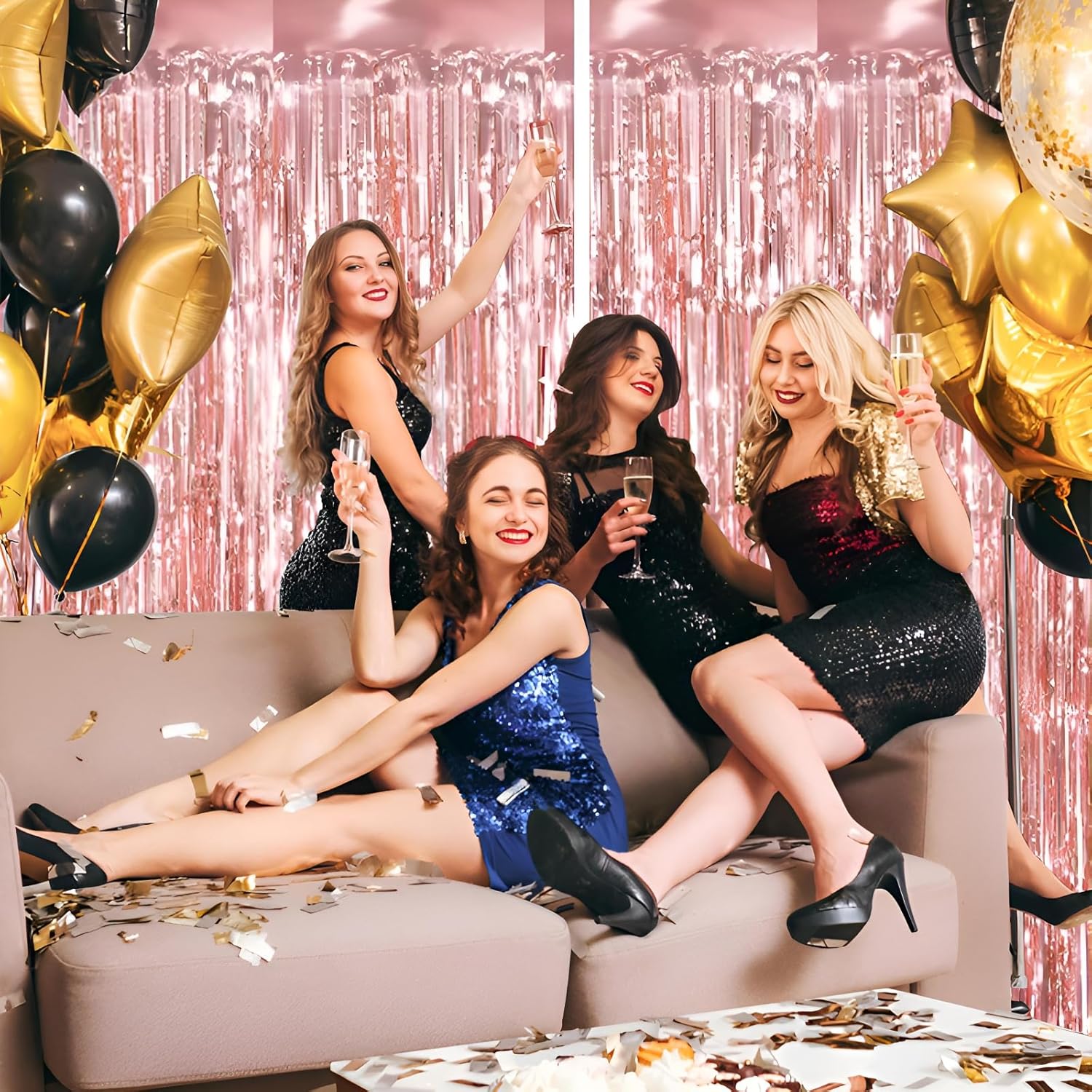 - Pair with other party decorations: Tinsel backdrop curtain can be paired with LED lights, balloons, banners, wreath, garlands, swirl streamer, tissue paper pom poms.