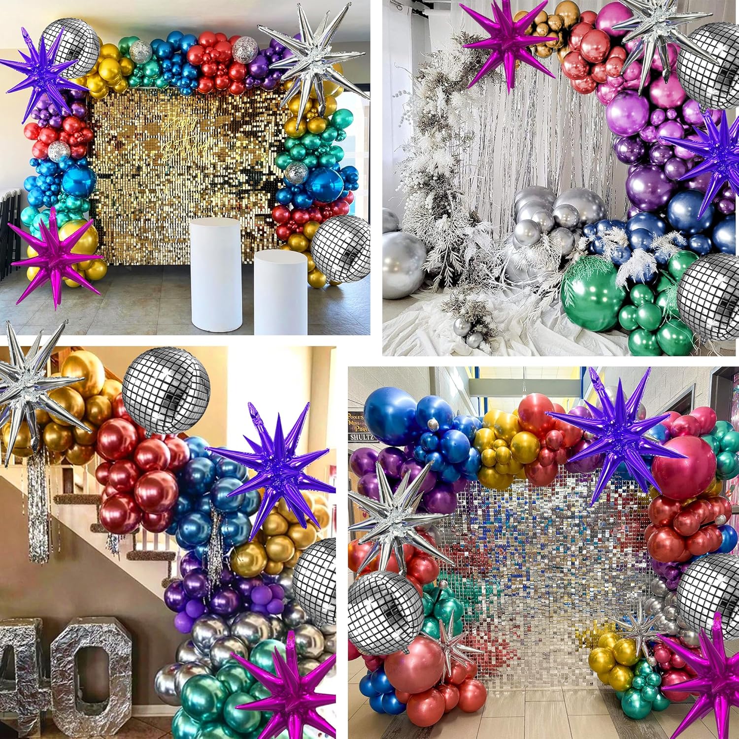 - 【Chrome colorful Disco Balloons】Includes the following 147 pcs balloons in different sizes 5"10"12"18", you have enough balloons to make a huge balloon arch! we choose chrome silver, chrome gold, chrome purple, chrome blue, chrome green, chrome hot pink, chrome red as Themed palette, add 2 pcs foil disco balloons and 3 pcs exploding star balloons, 3 pcs tool sets allows you to create a cheerful and vibrant atmosphere, perfect for 90s and 80s retro parties, birthdays and other decorations