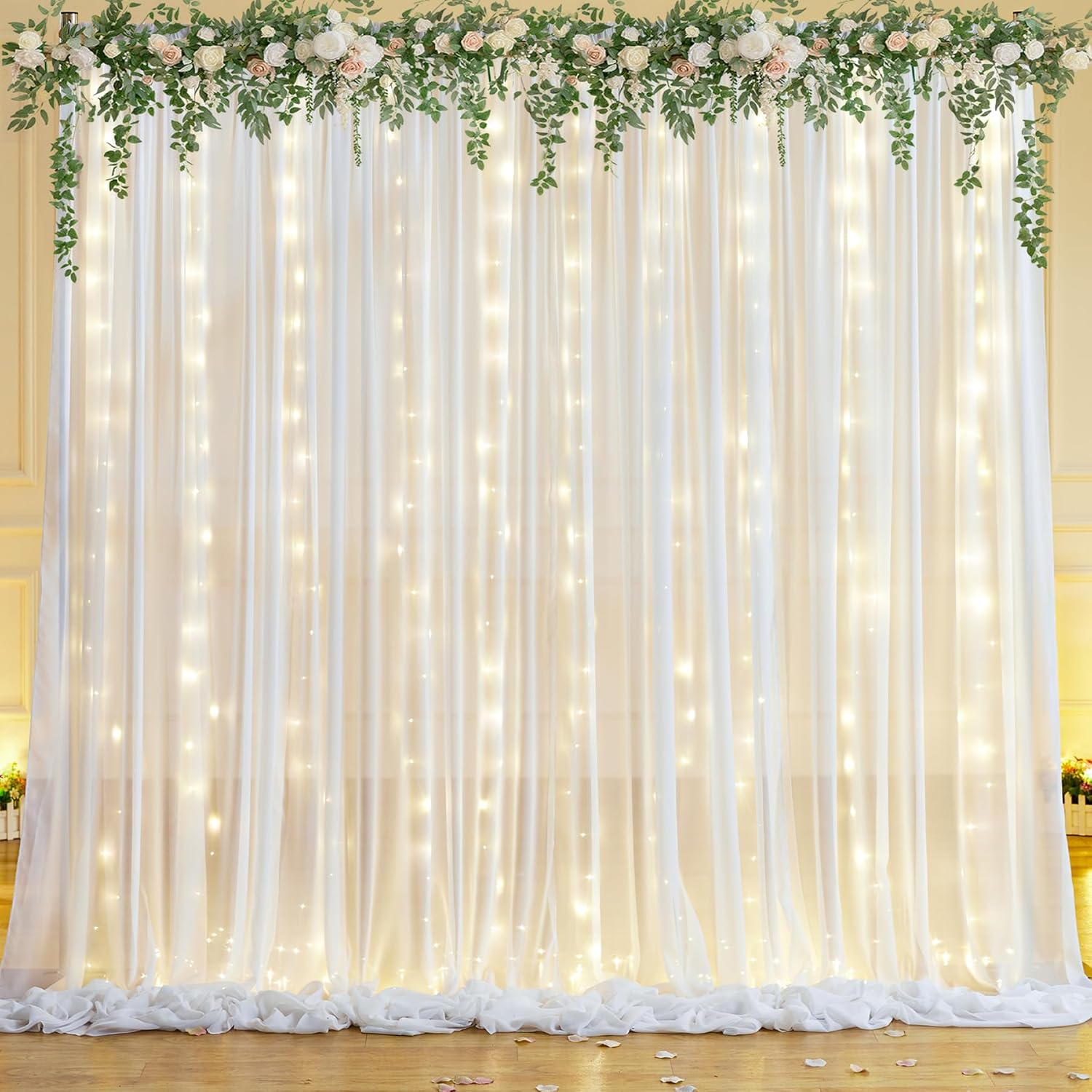 - 【Stunning Wedding Photo Backdrop】 Create a breathtaking ambiance with 10ft x 10ft semi-sheer chiffon backdrop curtain set. Includes 2 panels of 5ft(W) x 10ft(H) white backdrop curtains, a 9.8ft warm white light string, and 12 transparent clips. Using it as a sweet party or wedding reception backdrop curtain, surrounded with balloons or flowers. It will be a hit among your guests and made for stunning photos.