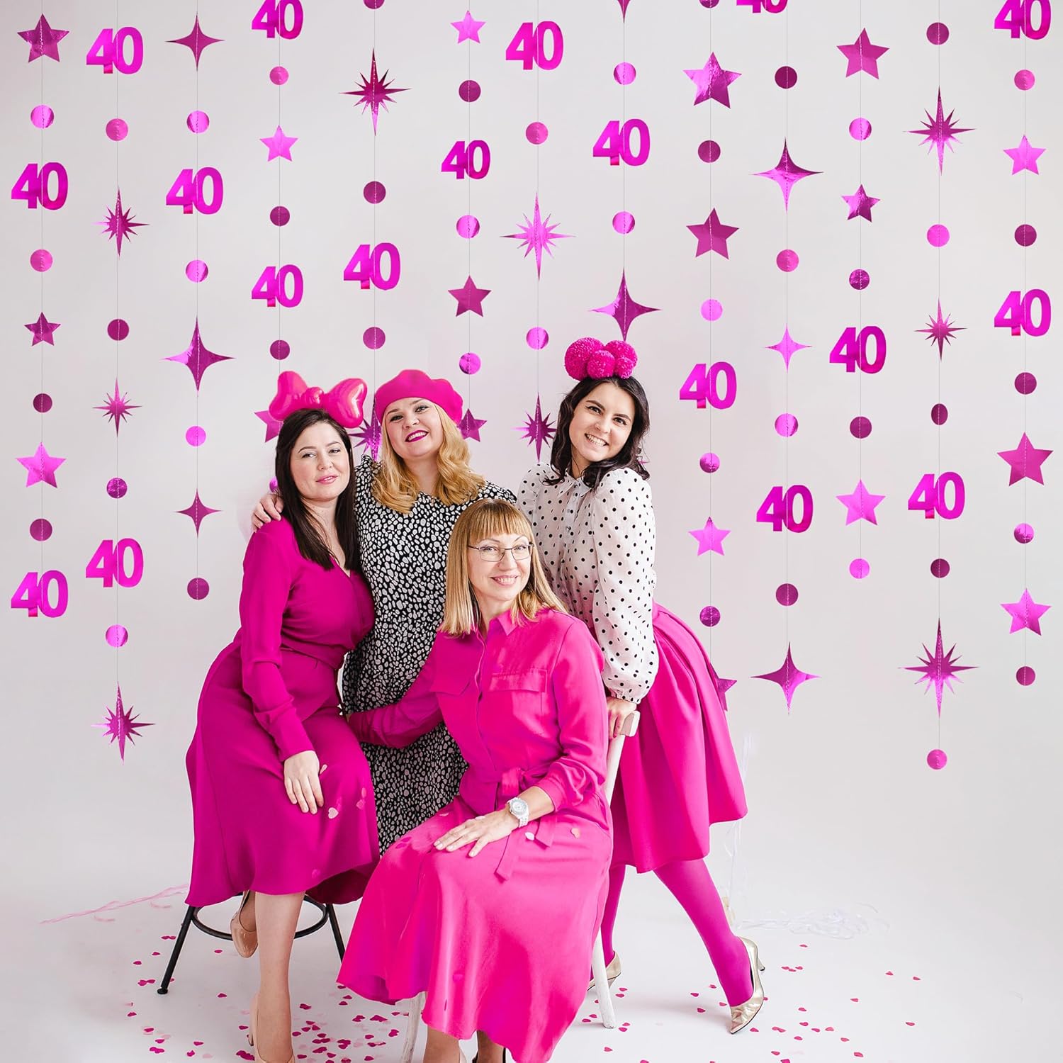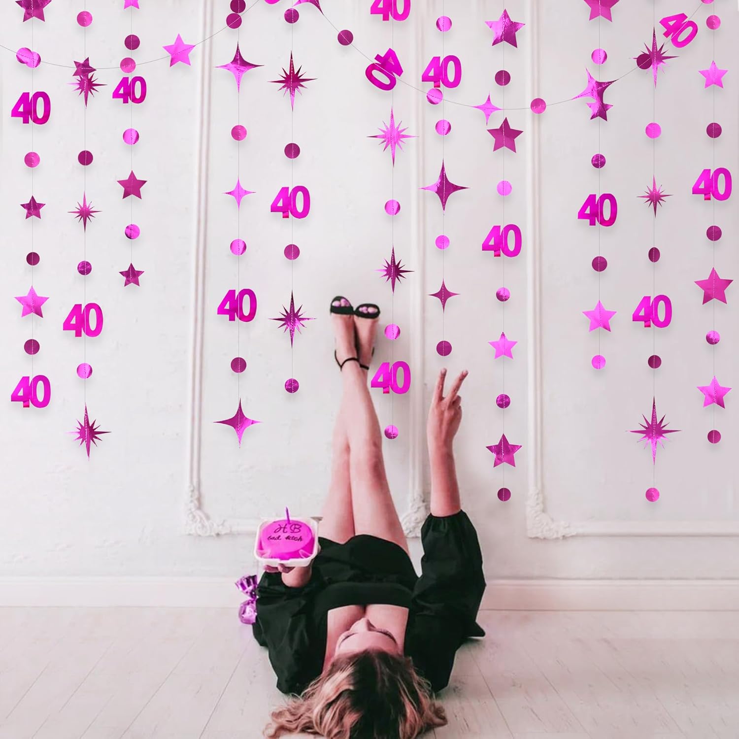 Hot Pink 40th Birthday Decorations Number 40 Circle Dot Twinkle Star Garland Metallic Hanging Streamer Bunting Banner Backdrop for Women Cheers to 40 Years Old Bday Forty Anniversary Party Supplies