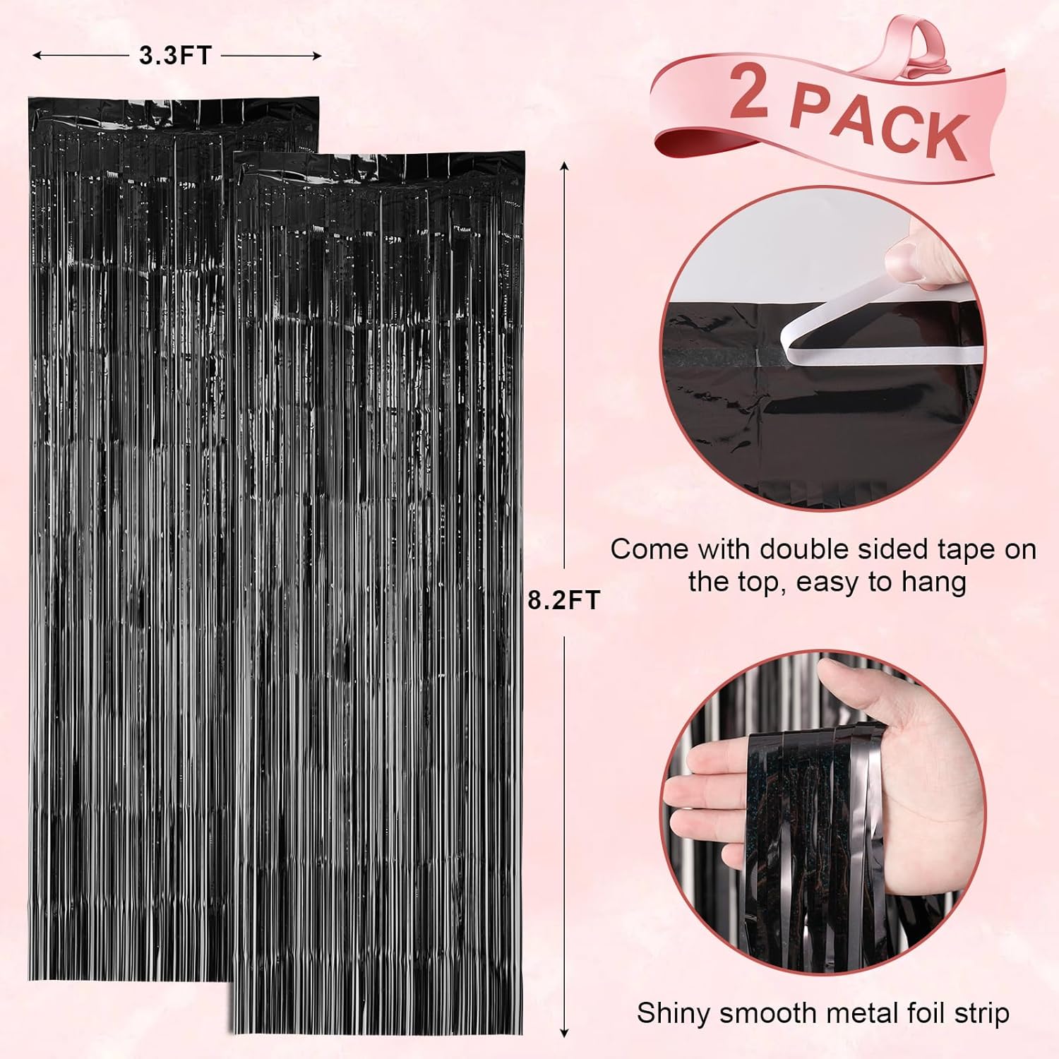 - Package Included: 2 packs of foil fringe curtains, the size of the foil curtain is 3.3*8.2 ft. It's long enough to fit any occasion. Please do not stick the foil curtain on uneven or stained walls to prevent it from falling off