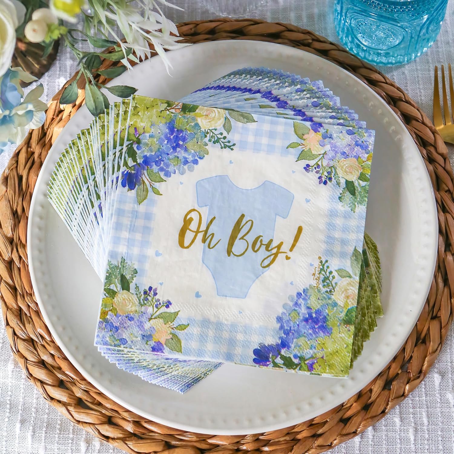 - BEAUTIFUL & FUNCTIONAL - Baby Shower Pink Onesie Floral Tableware Set for 16 Guests includes 16 9" in and 7" in Premium paper plates and 30 decorative napkins. The 9 in plate has gold foil borders and features a blue gingham and floral pattern with βOh Baby!β in gold foil. The 7 in plate has a gold foil and floral border with a pink onesie graphic and gold foil βOh Baby!β in the center.