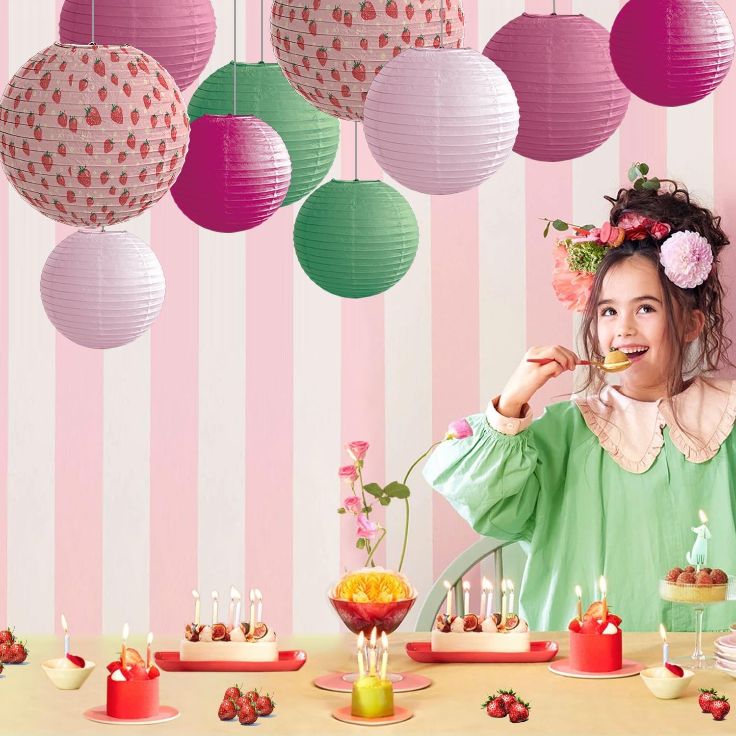 Paper Lanterns Pink Strawberry Girls Party Decor Hanging Chinese Lantern 12+10+8 inch Bohemian Decorations Baby Shower Ceilling Decor and Party Gift