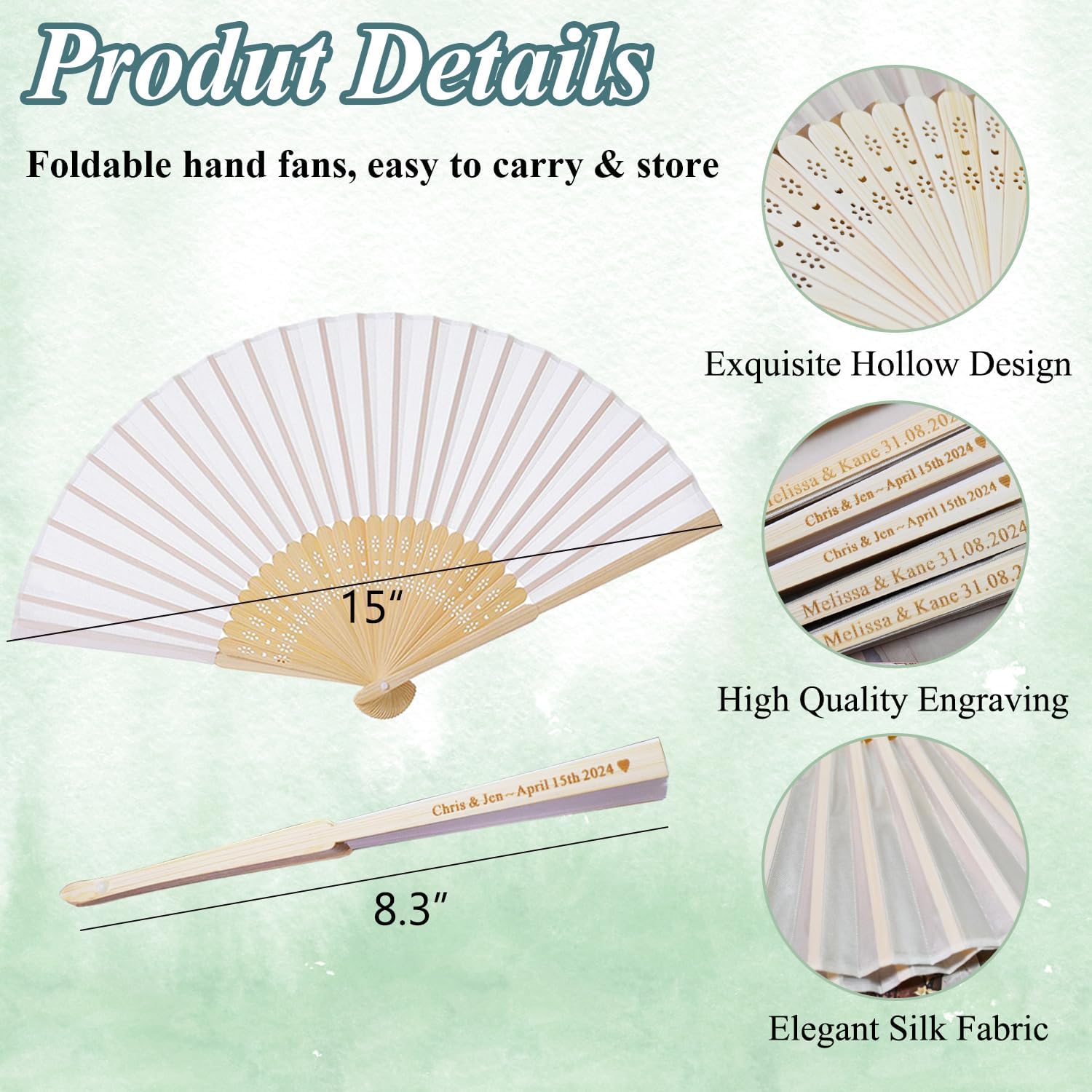 - 【Reusable Material & Long-lasting Engraving】: these handheld folded fans for wedding favors are made of quality bamboo and imitated silk fabric, sturdy and reliable enough to withstand a season of holiday wear and tear. The text will be engraved into the wood and will last for years.