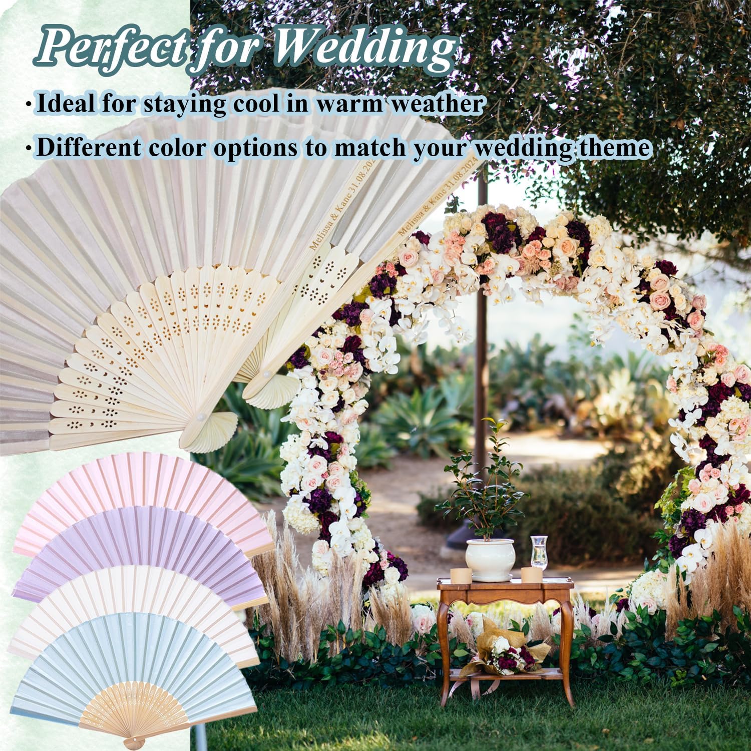 - 【Personalized Hand Fans】:These fans are made of silk fabric and quality bamboo, customized with names, dates or any text. Mutiple fancy fonts available to create a unique party gift for guests. White/Cream/Light Blue/Purple/Pink Fans are available to match your different party theme.