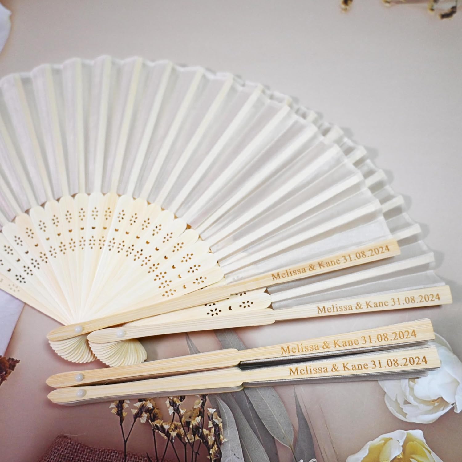 - 【Reusable Material & Long-lasting Engraving】: these handheld folded fans for wedding favors are made of quality bamboo and imitated silk fabric, sturdy and reliable enough to withstand a season of holiday wear and tear. The text will be engraved into the wood and will last for years.