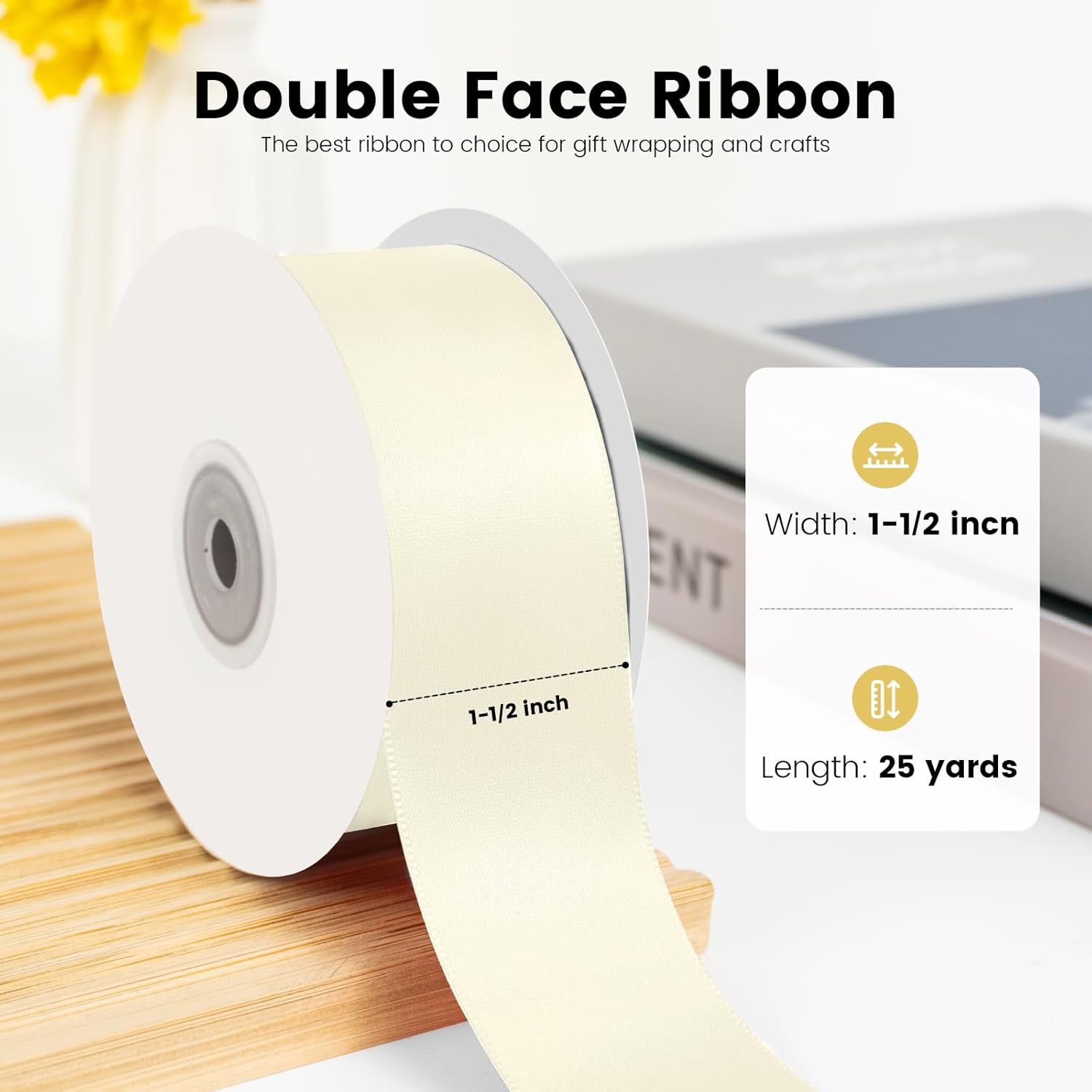 KMER LIFE 1-1/2 inch x 25 Yards Double Faced Polyester Ivory Satin Ribbon, Perfect for Gift Wrapping Very Suitable for Weddings Party Hair Bow Invitation Decorations and More