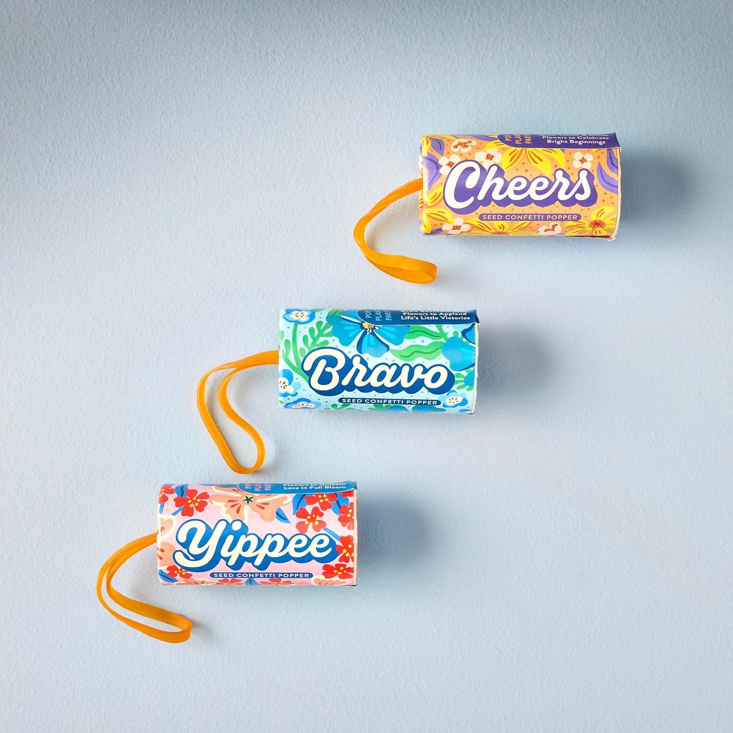 - Package Contents: Modern Sprout Seed Confetti Poppers - Bravo β Blue Flower Seed Blend: Baby Blue Eyes, Blue Flax, Cheers β Yellow Flower Seed Blend: Alyssum, Black-Eyed Susan, Yippee β Red & Pink Flower Seed Blend: Catchfly, Clarkia (Pack of 12)