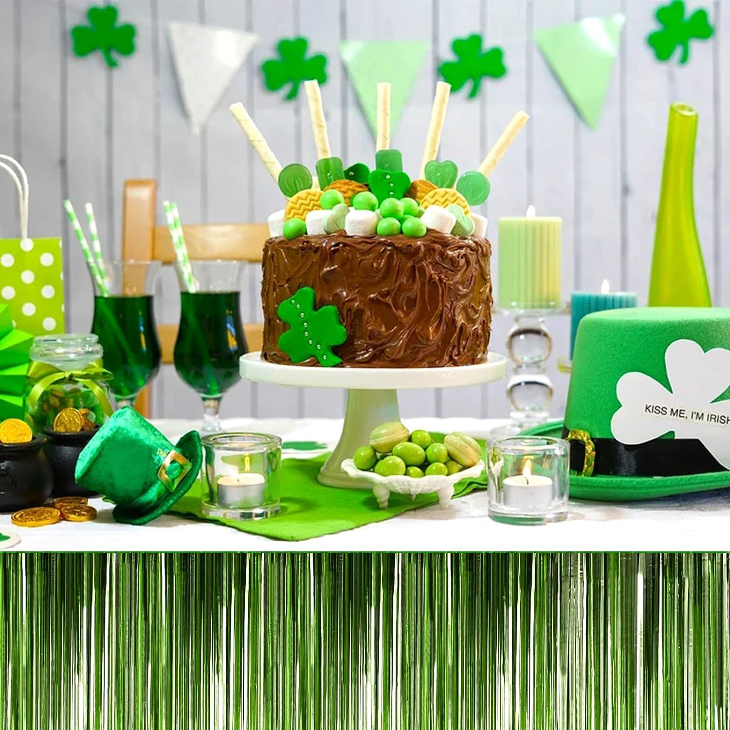 4P Metallic Foil Fringe Tinsel Table Skirts for Rectangle Tables Backdrop Banner Streamer Garland Curtains for Parade Floats Wedding Graduation Anniversary Birthday Parties Decoration (Light Green)