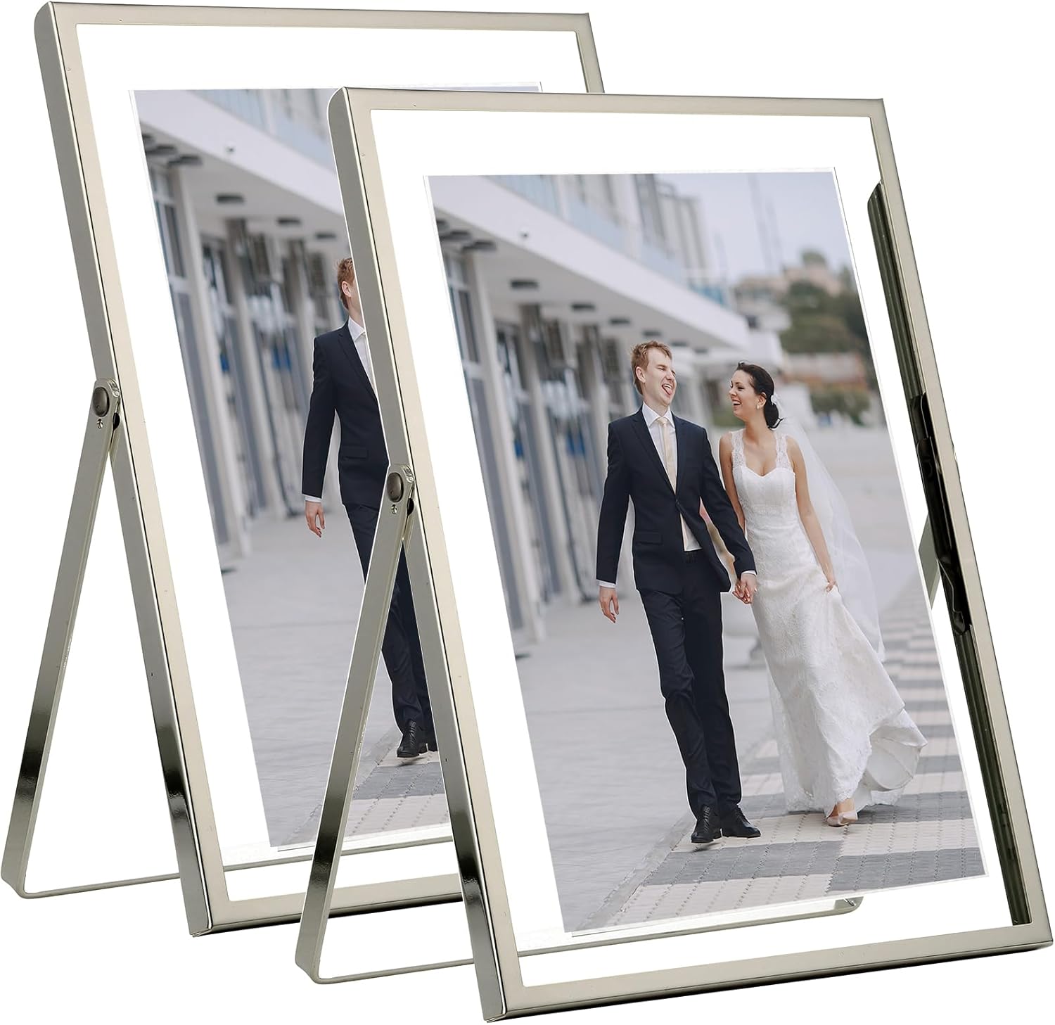 Silver 5x7'' Floating Frame Set of 2, For Photo Sizes ( 3.5x5'', 4x 6''), Silver Plated Metal Frames 5x7'' for Tabletop/Shelf Display, Classy Gift Choice for Wedding, Thanksgiving, Christmas,Birthady.
