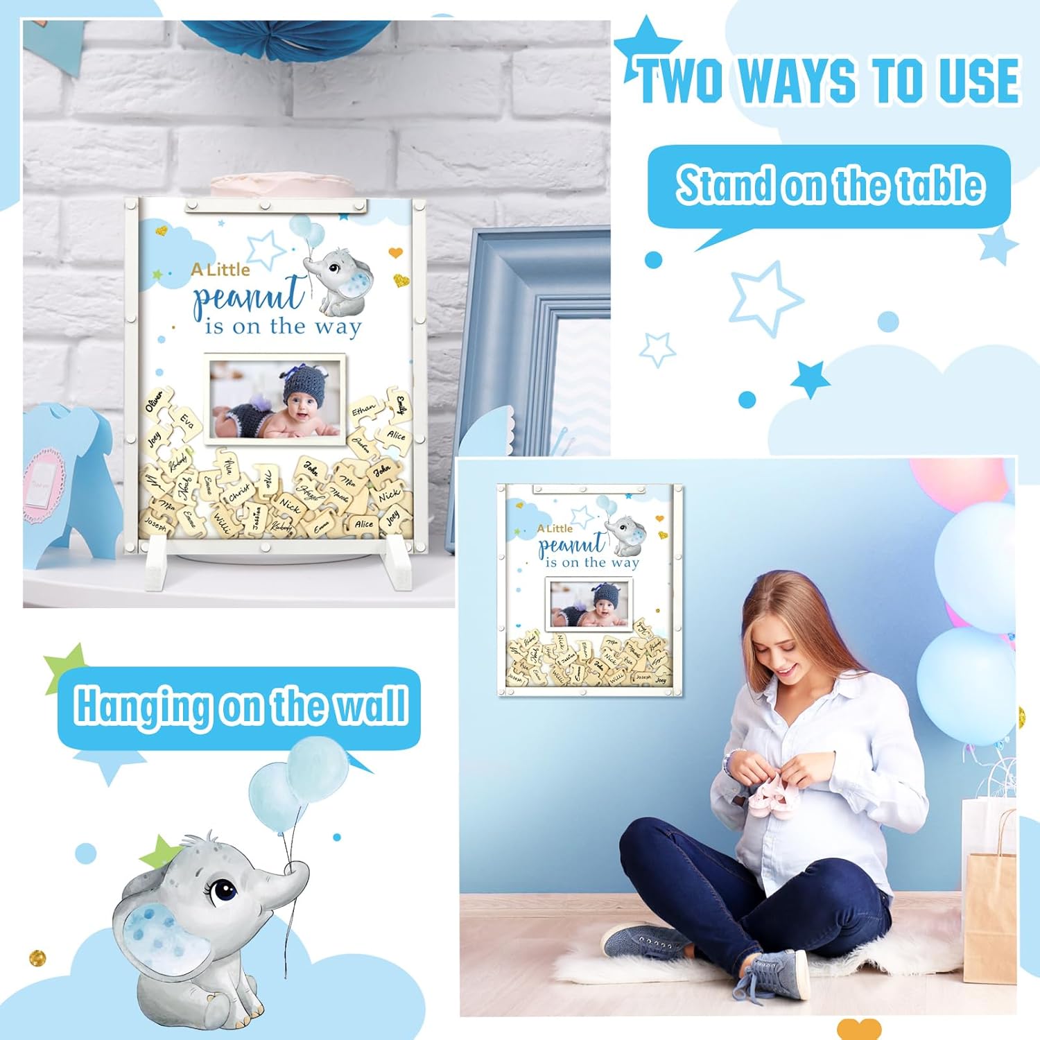 65 Pcs Elephant Theme Baby Shower Guest Book Alternatives Blue He or She Gender Reveal Baby Shower Decorations Sign in Guest Book with Picture Frame and 60 Wooden Chip