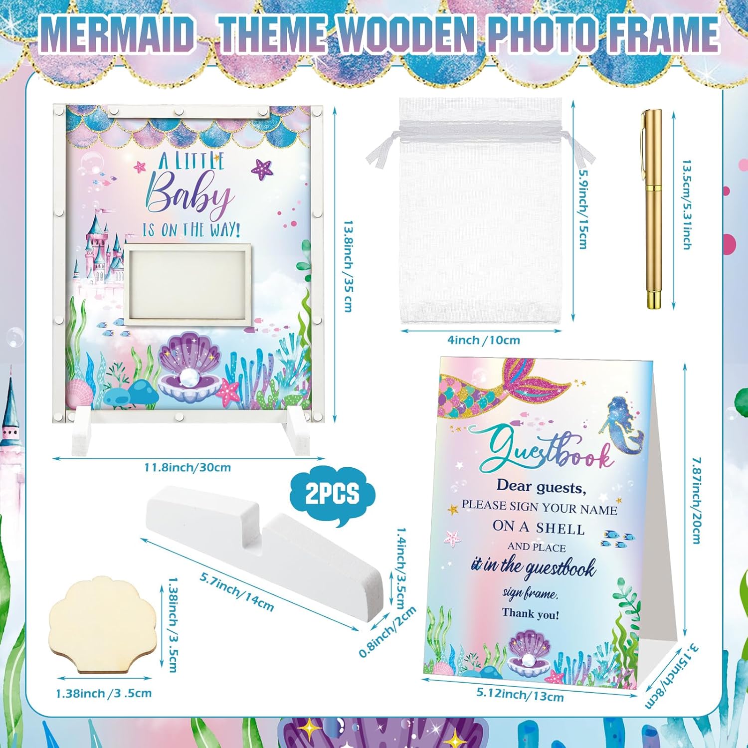 - Mermaid Baby Shower Decorations: you will receive a mermaid theme baby shower guest book with photo frame in 11.81 x 13.78 inches/ 30 x 35 cm, a pen, 60 mermaid wood cutouts, 1 organza bag, 2 display shelves, enough to meet the needs of your mermaid themed baby shower party