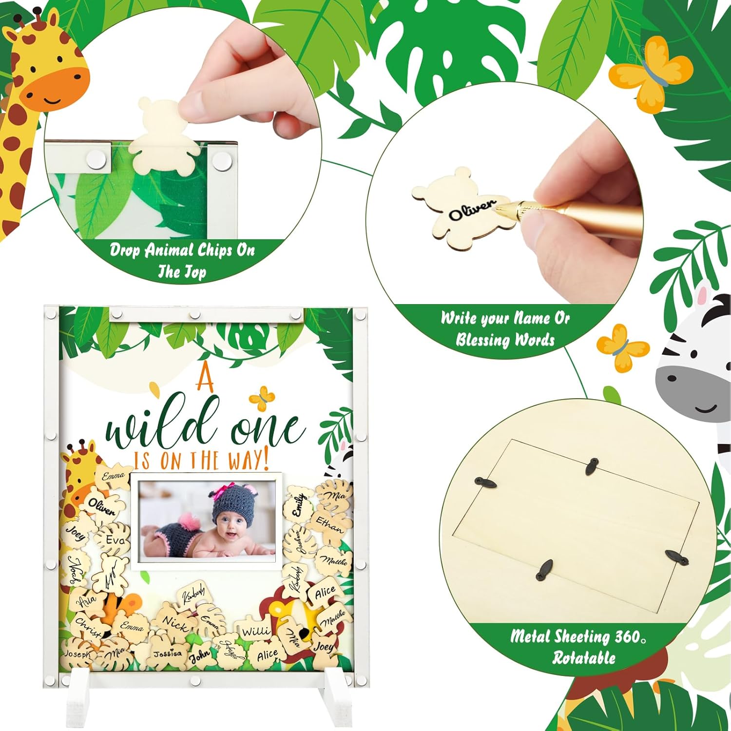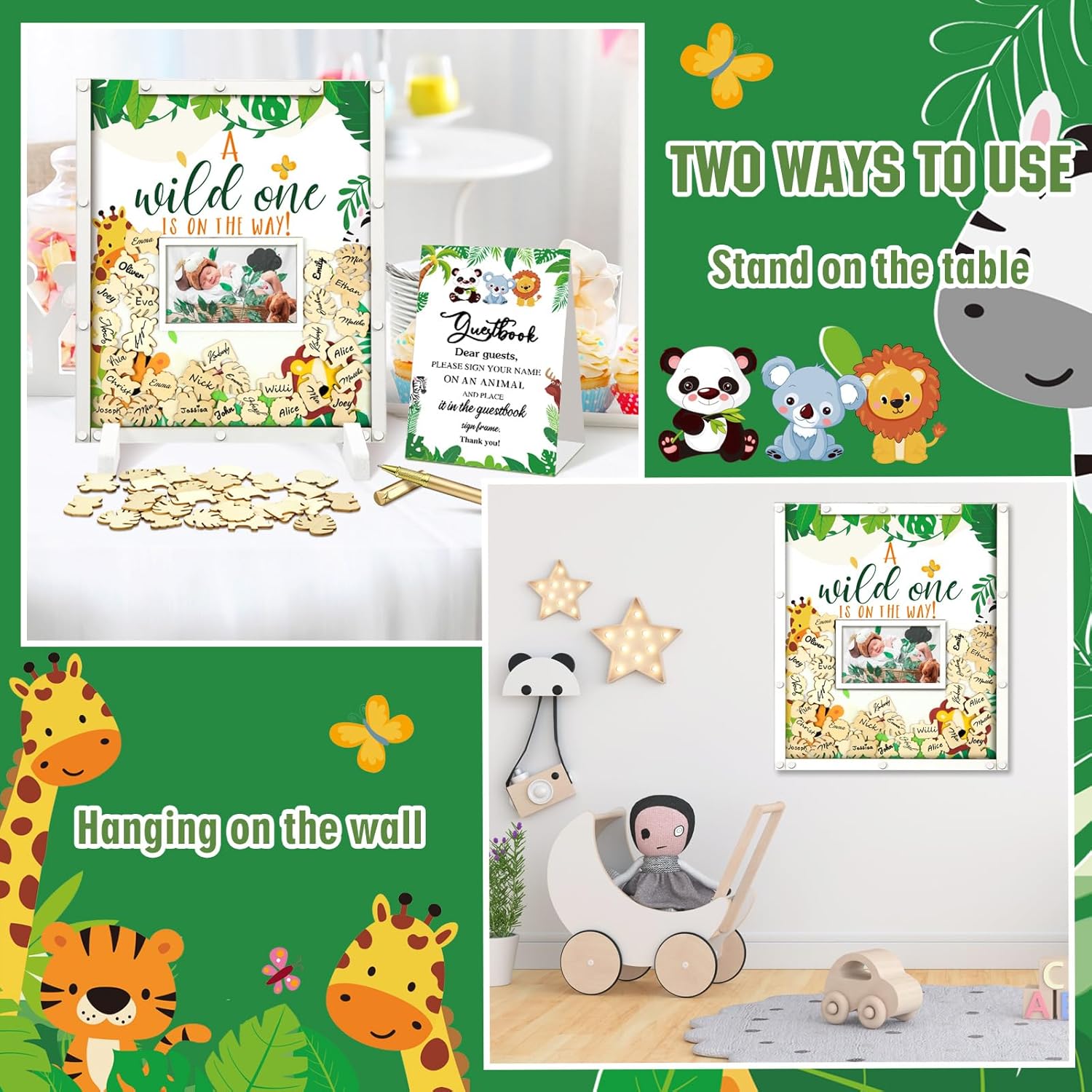 - Safari Animal Baby Shower Decorations: you will receive a wild one is on the way theme baby shower guest book with photo frame in 11.81 x 13.78 inches/ 30 x 35 cm, a pen, 60 safari animal wood cutouts, 1 organza bag, 2 display shelves, enough to meet the needs of your safari animal themed baby shower party
