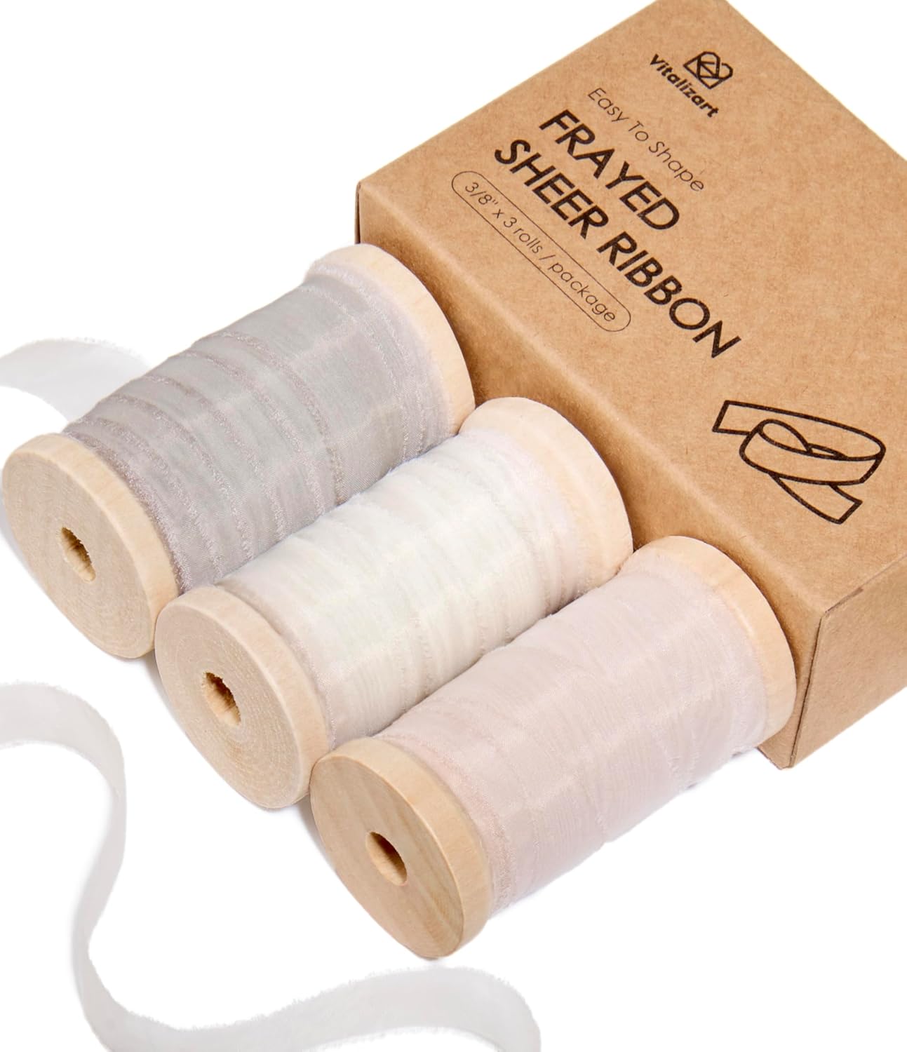 Vitalizart Organza Ribbon Frayed Sheer Organza White Pink Grey Set 3/8" Silk Like Ribbons for Valentines Day Gift Wrapping Craft Flower Bouquet Wedding Invitations Mesh Fabric 15 Yards