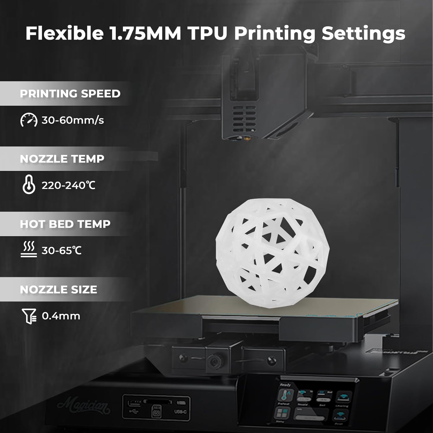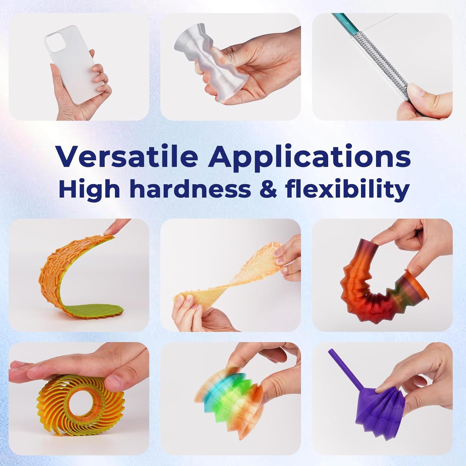 - ăQuality Flexible TPU FilamentăOffers a great combo of softness and flexibility. Good shaping, strong toughness, no bubble, no jamming, no warping, melts well, feeds smoothly and constantly without clogging the nozzle or extruder. Glossy smooth appearance, perfect for arts, crafts, and DIY. Beginner & expert friendly
