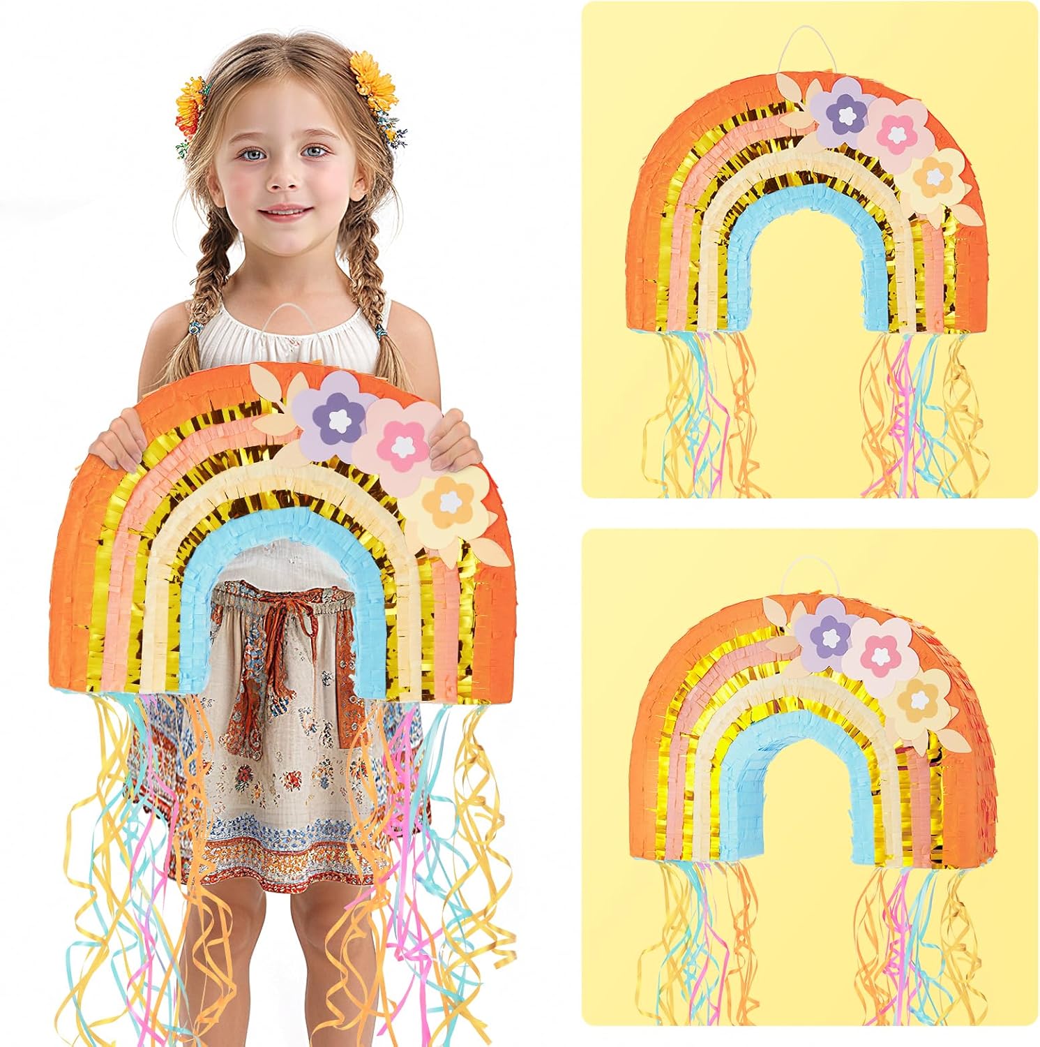 - 【COLORFUL BOHO DECOR】 - This kids piñata is designed with colorful bohemian rainbow, embodying the essence of charming summer vibes. The fantastic color of the piñata features orange, pink and gold, adding a touch of elegance to any children's party or celebration.