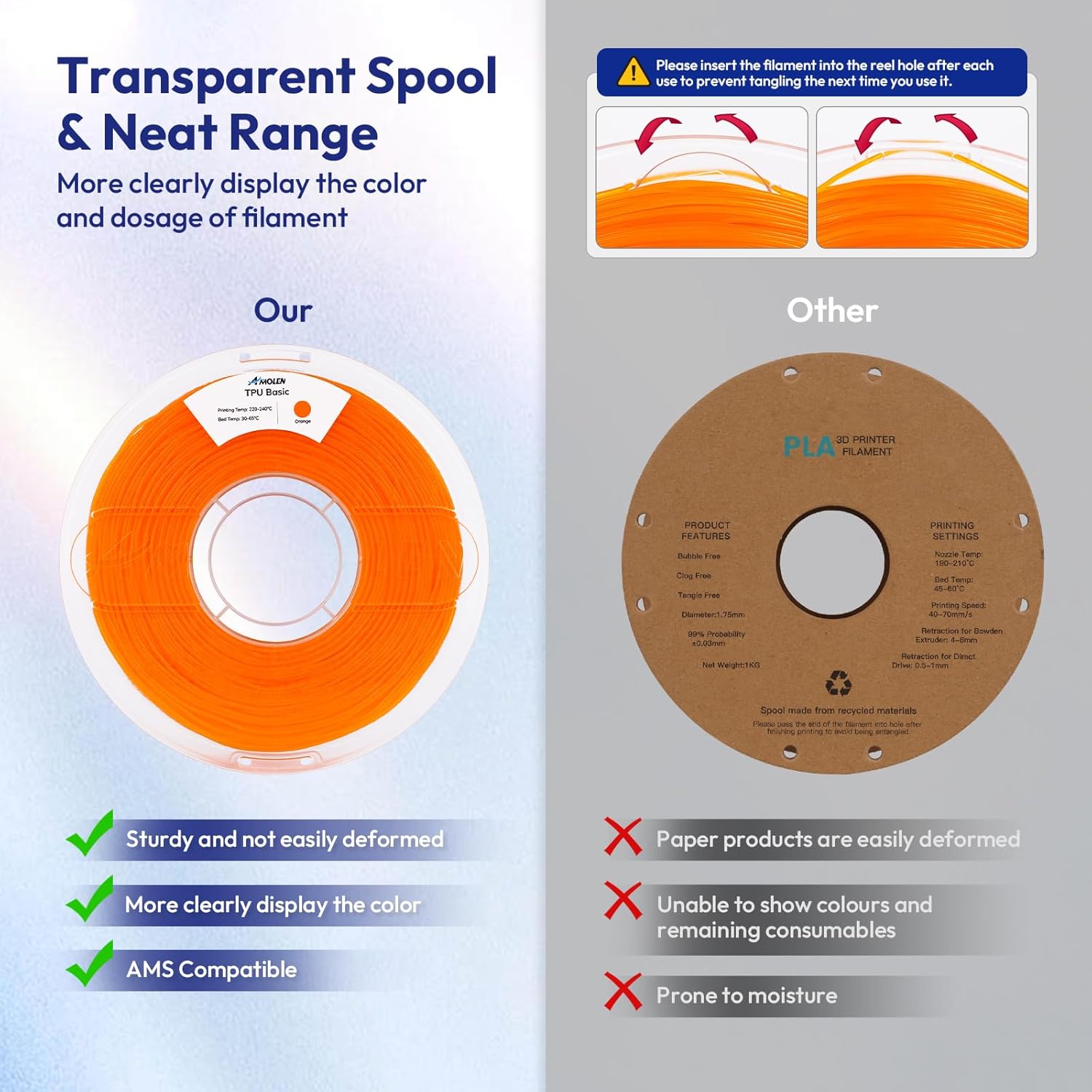 - 【Perfect Winding & Easy Printing】Using the latest intelligent winding machine and manual inspection guarantees each roll of color tpu filament is neat and tidy. AMOLEN high-quality TPU printer filament is tangle and clog-free. Printing Temperature 190-220℃; Printing Bed (Optional) 0-60℃; Layer Height 0.15mm. Tip: Please pass the filament through the fixed hole to avoid tangles after use