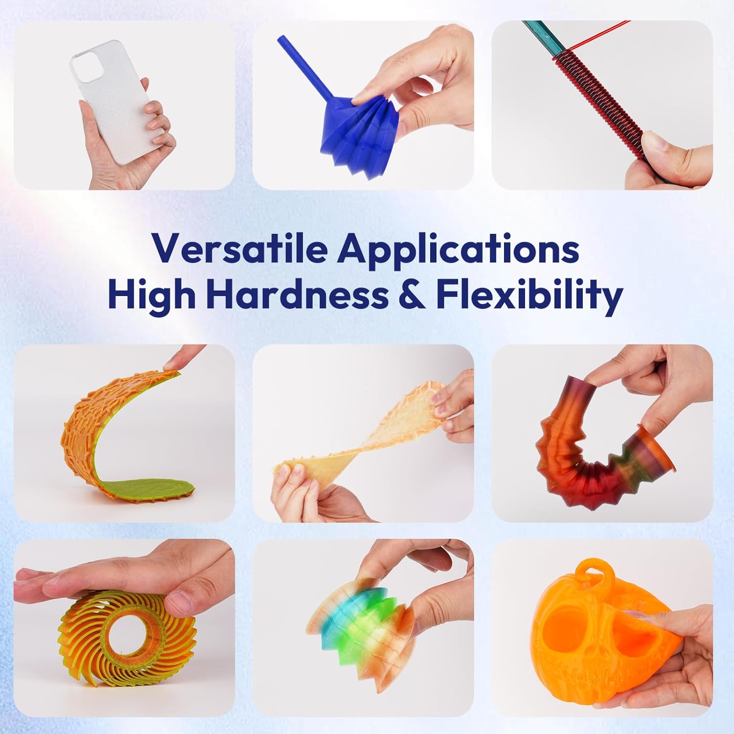 - 【High Elastic & Soft 95A Filament】Our TPU Filament has a shore hardness of 95A and can stretch 3 times more than its original length. A perfect balance between flexibility and durability is widely applied to arts, crafts, and DIY to maintain your prints stronger and more resilient
