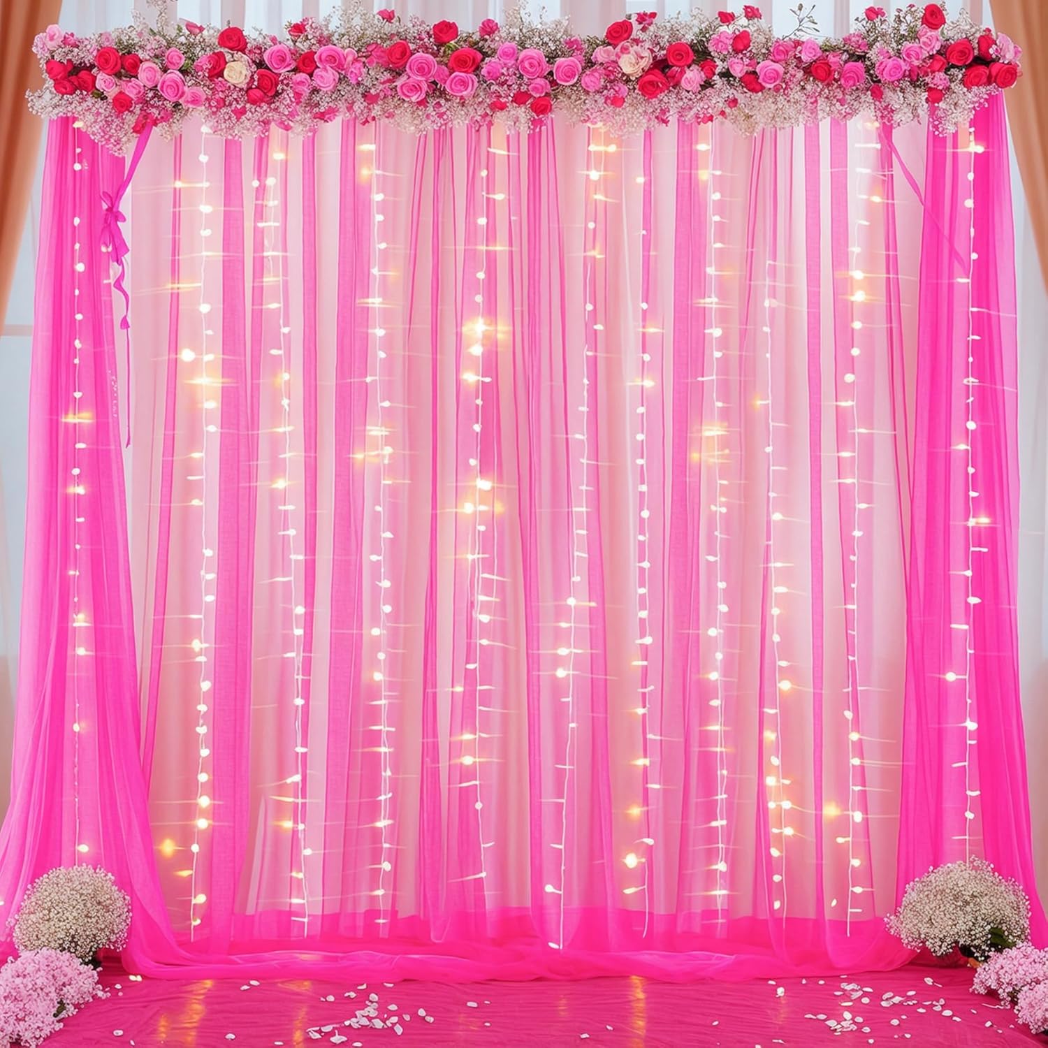 - SHEER BACKDROP CURTAINS: Hot pink tulle backdrop curtain is perfect for making a background backdrop to a sweets table or for a photo area when decorating a party. Used as backdrop curtains for parties and baby shower decorations along with balloons and fairy light or wrapped around the wedding arch