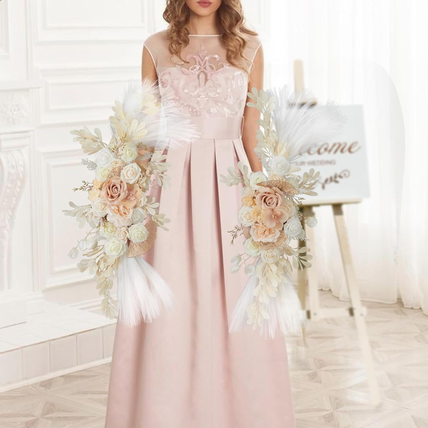 Wedding Arch Flower Kit of 2 - Artificial Flower Swag Wedding Welcome Sign Decorative Floral Swags for Wedding Reception Ceremony Signs Wedding Chair Ceremony Floral Decor (Beige)