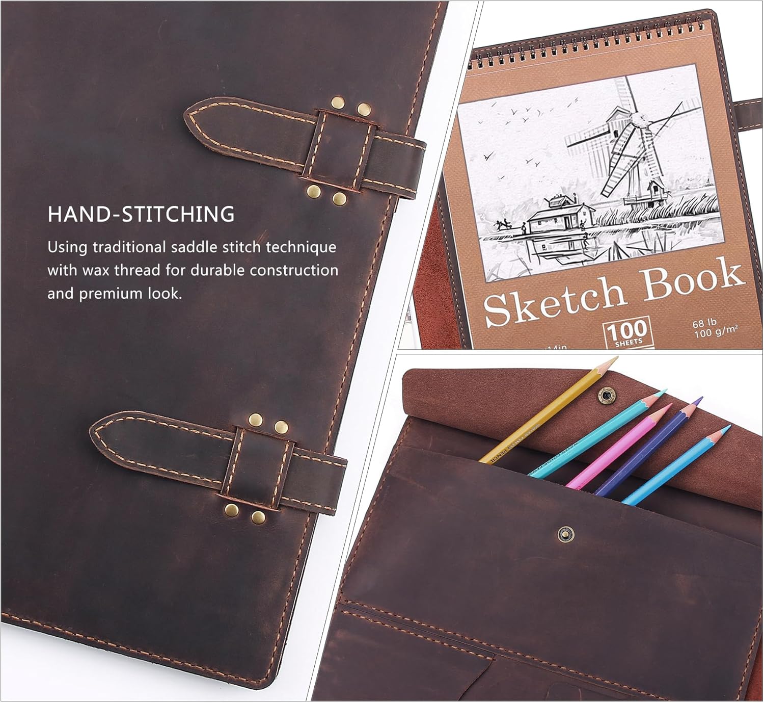 - BEAUTIFULLY HANDCRAFTED - This is a beautifully crafted and versatile sketchbook cover is entirely handmade from high-quality distressed genuine leather for durability and a premium feel. Over time the leather will develop a unique patina. Meanwhile, manual stitching with waxed thread complements to the retro vibe and provides enhanced durability.