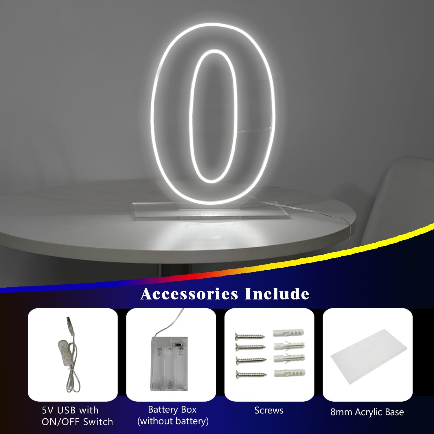Number 0 Neon Sign Light, 16.54" Cool White USB Battery Powered Led Neon Sign for Party Wedding Anniversary Decor Light Sign (Number 0)