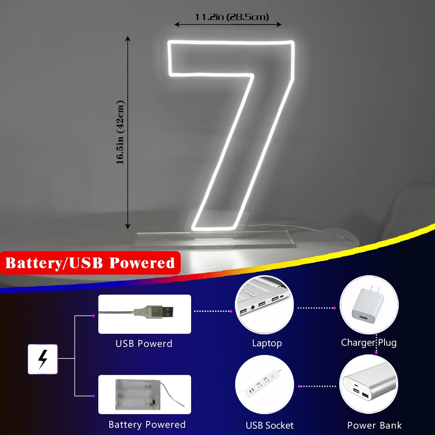 Number 7 Neon Sign for Birthday, 16.54" Cool White USB Battery Powered Led Neon Sign for Party Wedding Anniversary Decor Light Sign (Number 7)