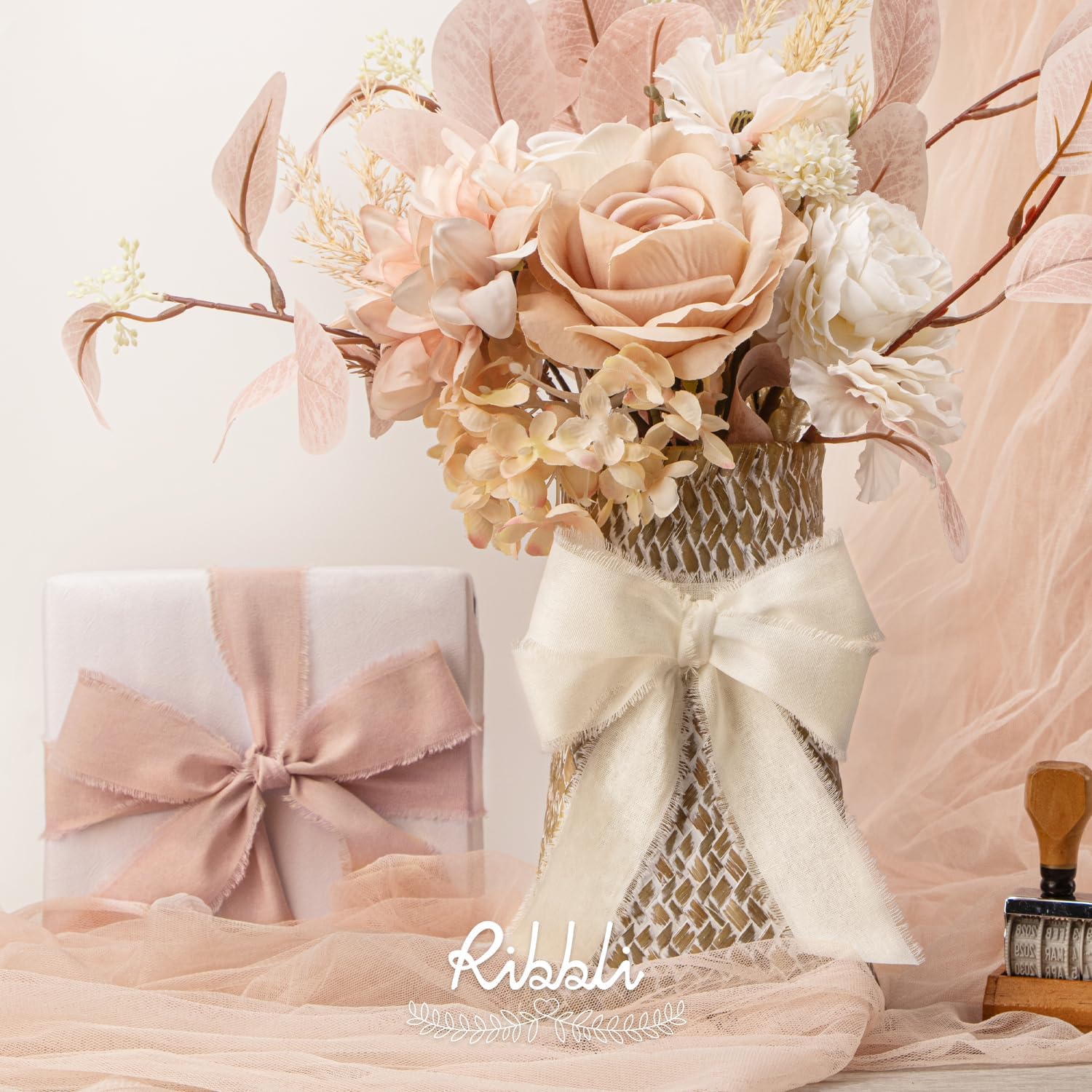 Ribbli 3 Rolls Pink Ribbon 1.5 Inch x 18Yards Ivory Blush Dusty Pink Handmade Cotton Frayed Fringe Ribbons for Gift Wrapping Wedding Invites Bridal Bouquets Baby Shower DIY Crafts Home Decor