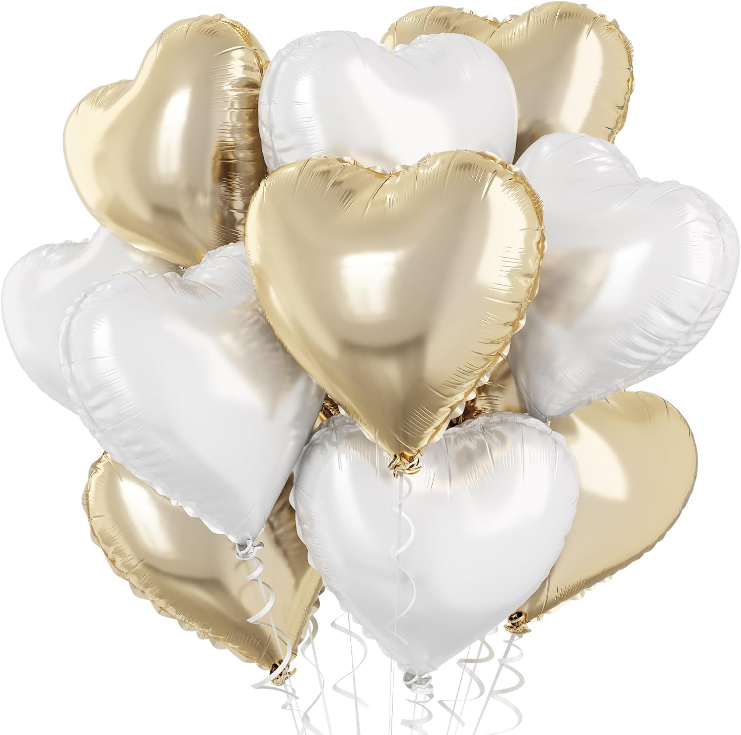 - Gold White Heart Balloons: There are 10pcs 18 inch heart foil balloons. Includes 5pcs 18 inch light gold heart foil balloons, 5pcs 18 inch white heart foil balloons and 1pc ribbons.