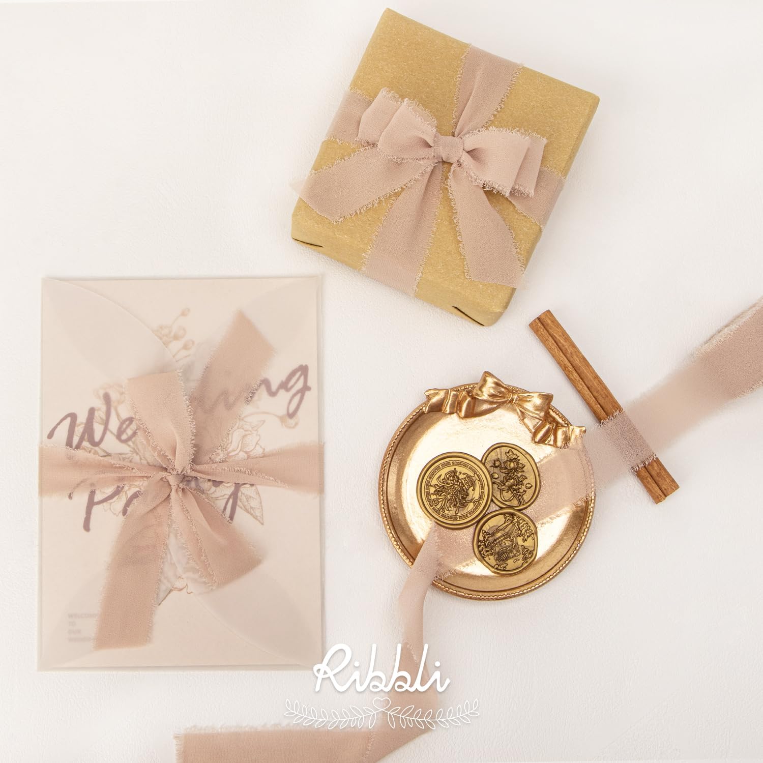 Ribbli Beige Ribbon 1 Inch x 3 Rolls Total 24 Yards Natural Handmade Fringe Chiffon Silk Ribbon for Wrapping Wedding Invitations Bridal Bouquets DIY Crafts Home Decor