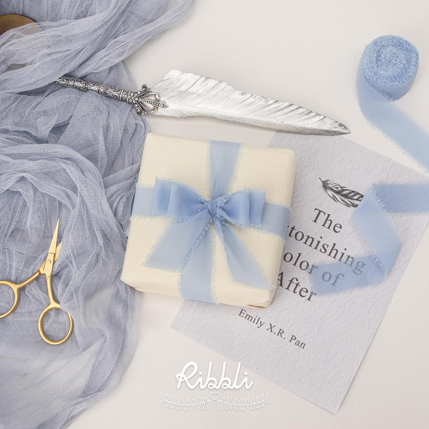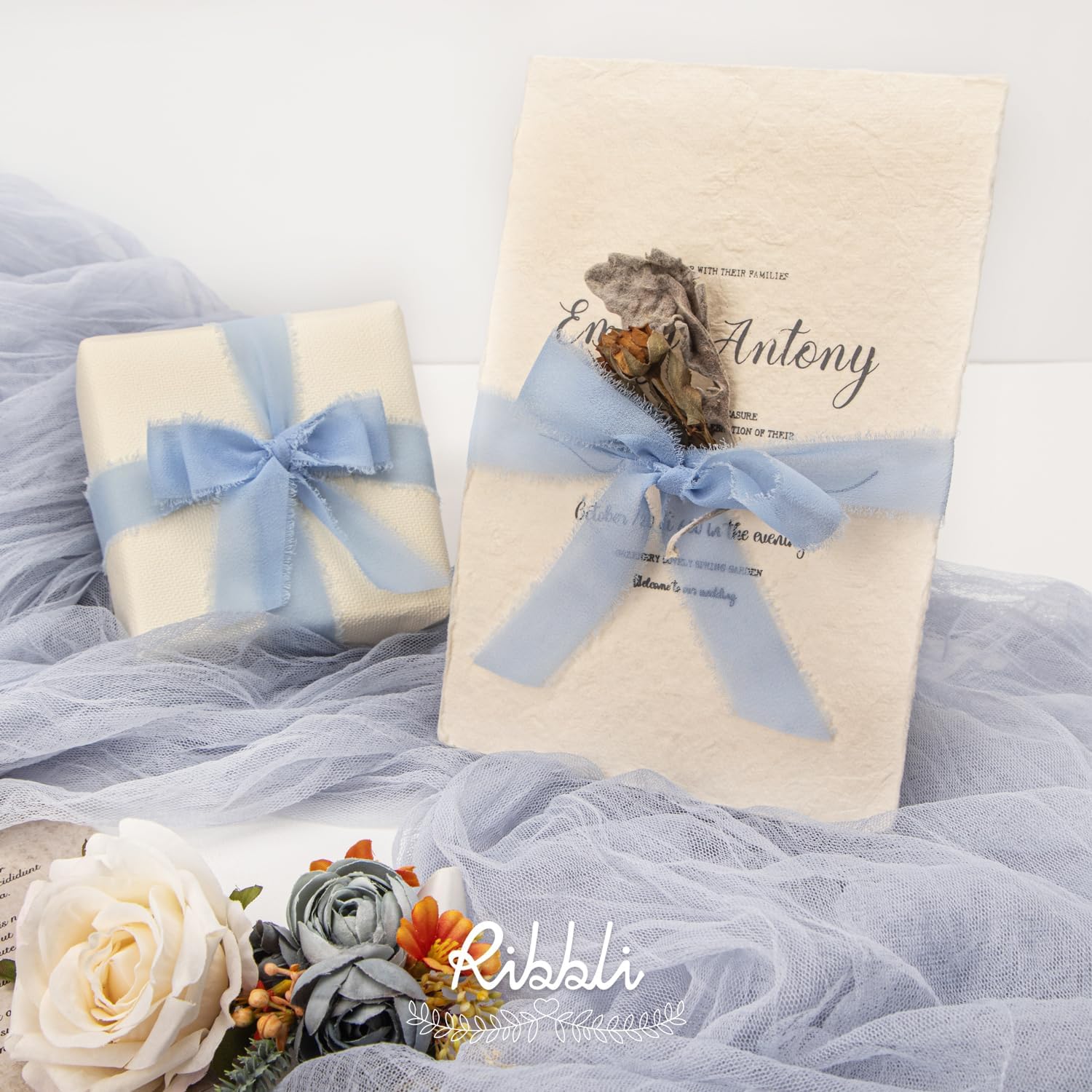 Ribbli Light Dusty Blue Ribbon 1 Inch x 3 Rolls Total 24 Yards Light Blue Handmade Fringe Chiffon Silk Ribbon for Wrapping Wedding Invitations Bridal Bouquets DIY Crafts Home Decor