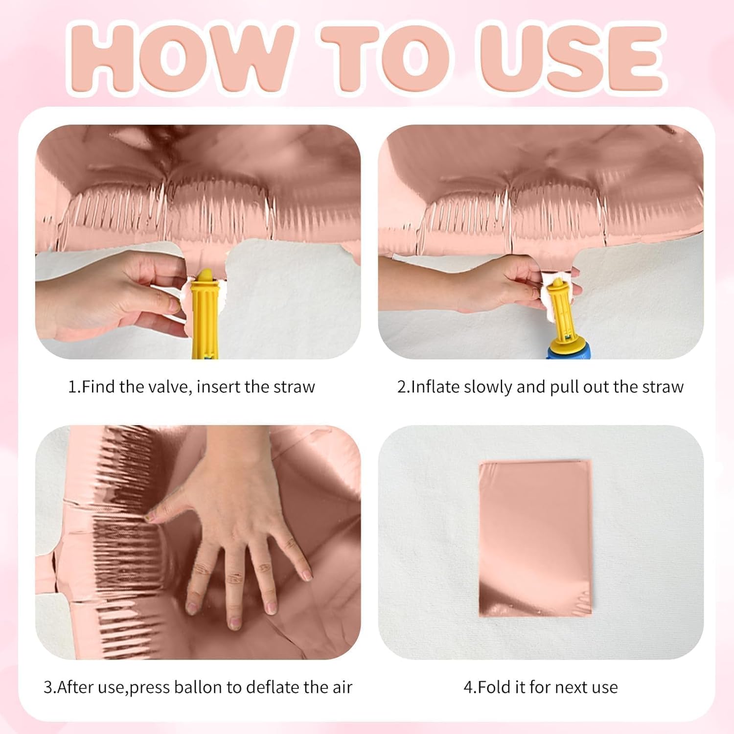 - Easy To Use:These rose gold heart foil balloons are suitable for helium or air. Easy to inflate using the a straw or an air handheld pump. This heart foil balloon adopts self-sealing design, you only need to press the inflation port to seal it after finishing inflate. The balloons are reusable and can be folded up for next use after being deflated with a straw.