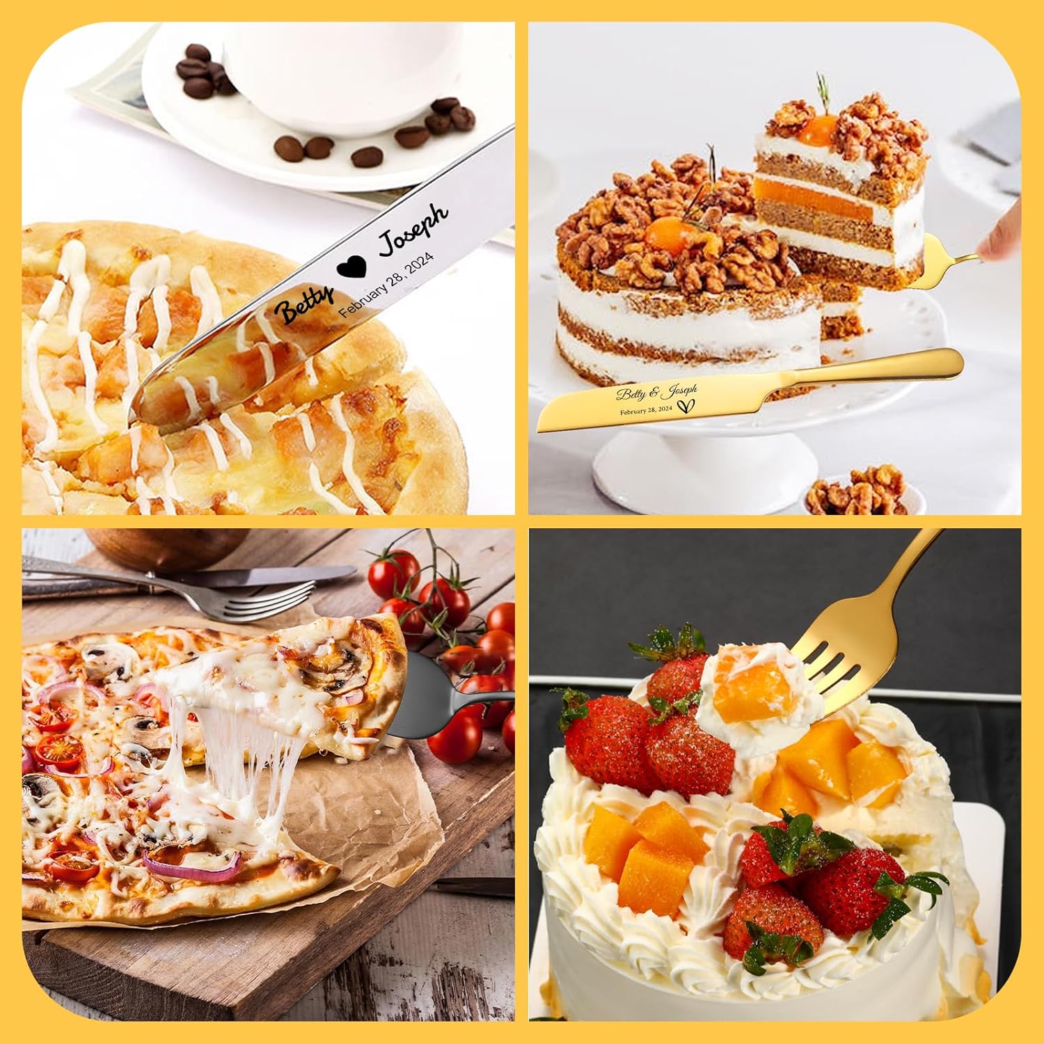 - Personalized Cake Server and Knife Set: Our Wedding Knife and Cake Server Set comes with 4 pieces, a cake knife, a cake server and two forks. It can be engraved with your names and date or your favorite symbol. The classic style and elegant engraved text will add unique romance and elegance to weddings, anniversaries or parties, creating wonderful memories.