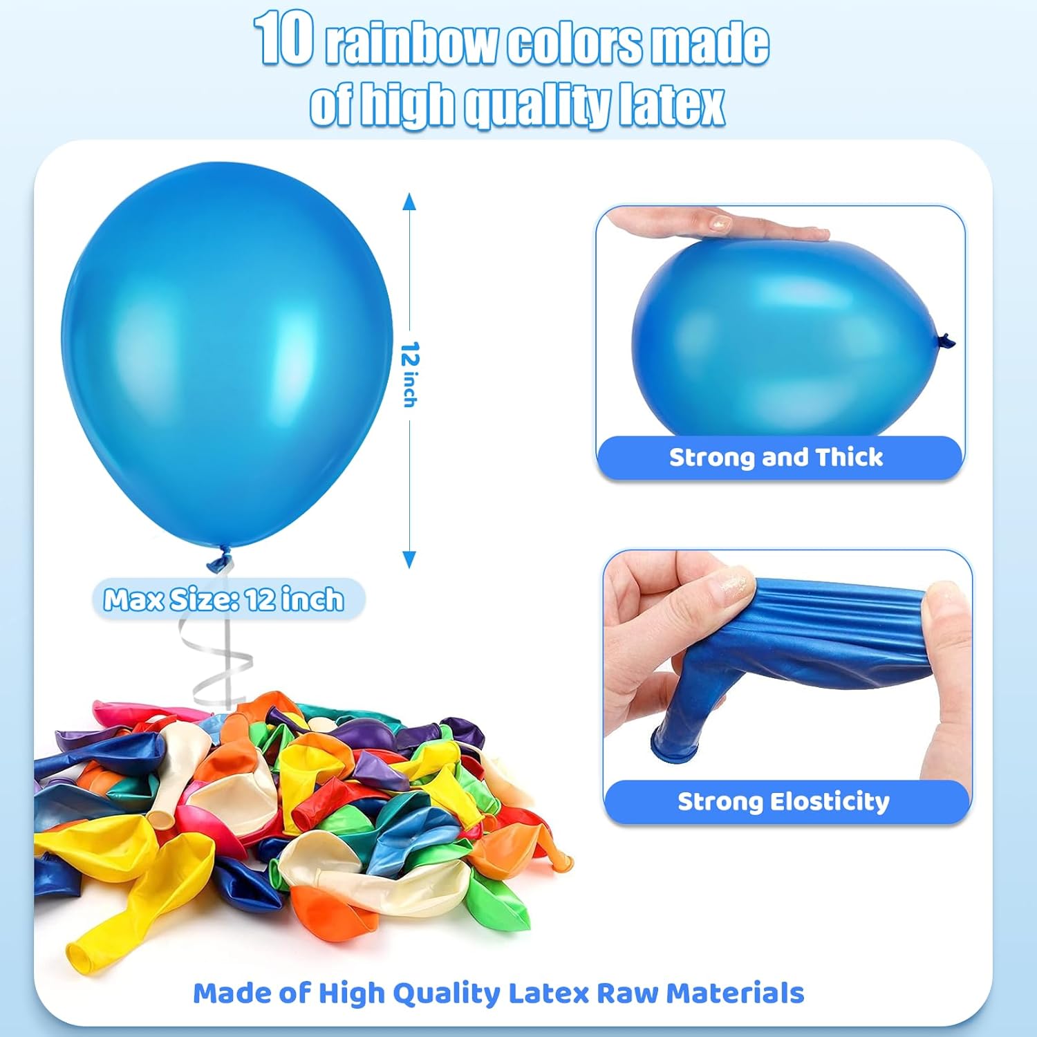 - 【Rainbow Party Balloons】 Each sets contains 120 pcs assorted party balloons of 12 inches 10 colors (red, orange, yellow, pink, dark green, light green, dark blue, light blue, dark purple, champagne gold) and 1pcs white ribbon (33 feet total). These multicolor balloons could make any dull space full of vitality and joy